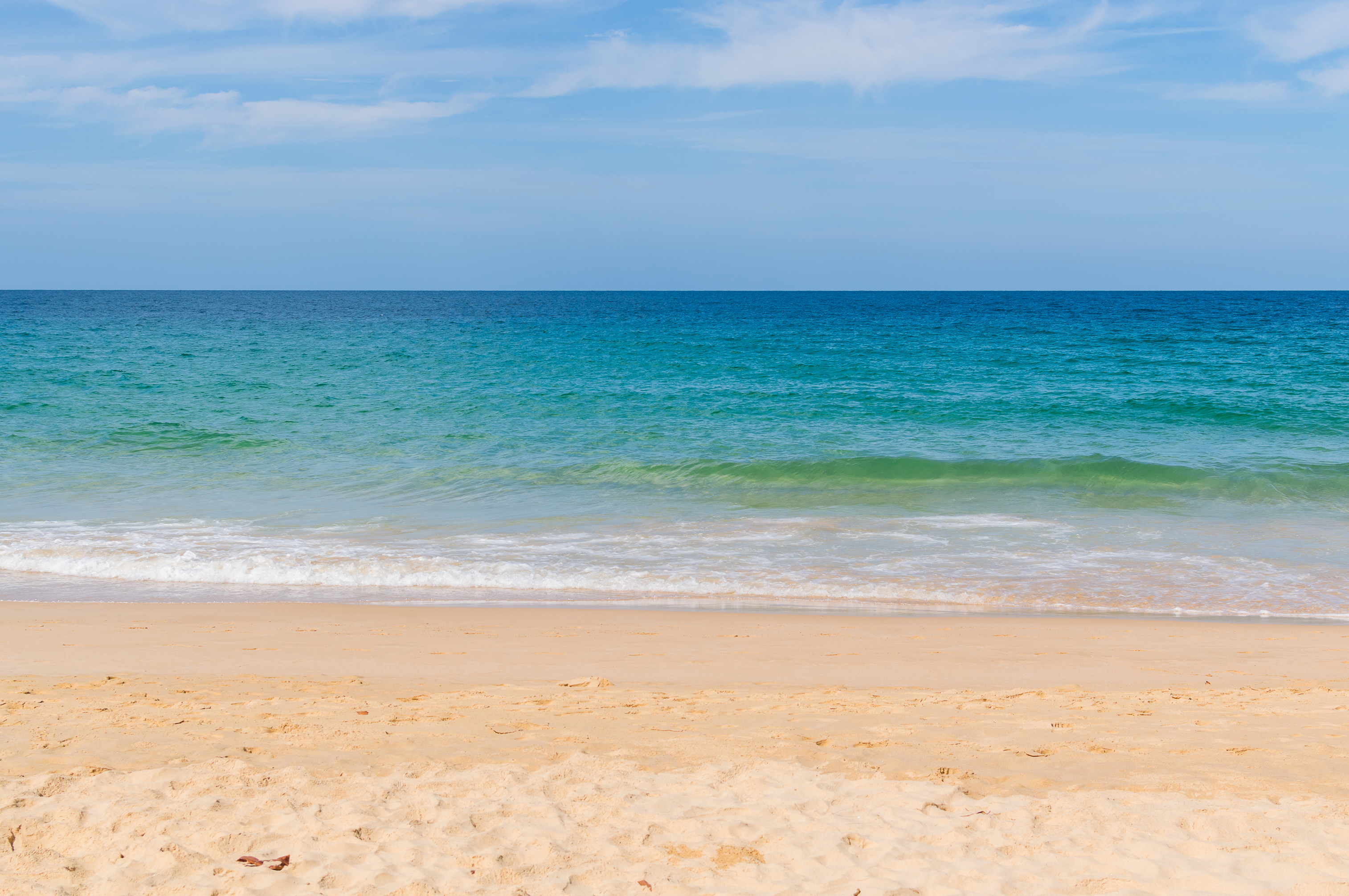 Композиция тщательно сбалансирована: передний план доминирует текстурированным песком, раскрывающим незаметные следы ног и естественные остатки моря, а средняя часть показывает волны, разбивающиеся в мягкой белой пене, прежде чем отступить в яркое море. Вода переходит от полупрозрачного зеленого у берега к насыщенному туркизовому дальше, отражая солнечный свет со сверкающим эффектом. Небо выше представляет собой градиент светло-голубого цвета, добавляя глубину без того, чтобы перекрыть яркие тона океана. Мелкие детали, такие как песчинки и мягкие волны, резко переданы, усиливая реалистичность фотографии.