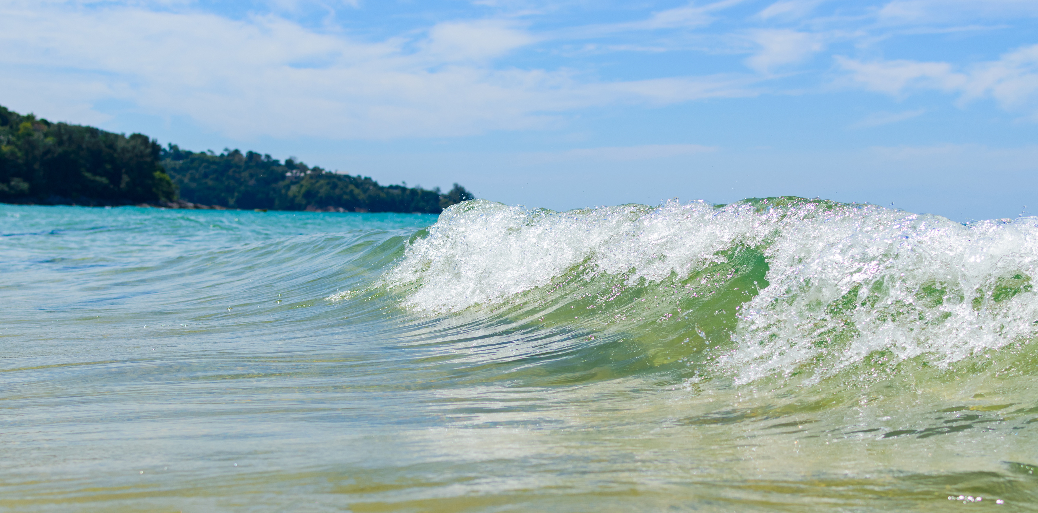 Композиция мастерски сбалансирована: передний план демонстрирует мерцающую воду с тонкими рябью, переходящую в мощную волну, доминирующую на среднем плане. Фон раскрывает зеленые заросли на далеком побережье под обширным небом, заполненным легкими облаками. Освещение — естественный дневной свет, отбрасывающий резкие отражения и подчеркивающий каждую деталь — от пенящейся текстуры волн до прозрачного качества мелководья. Цвета варьируются от глубокой бирюзы до насыщенных зеленых в центре волны, затем переходящих к бледным желтам у берега, все это на фоне ярко-синего неба. Текстуры разнообразны: гладкие поверхности воды контрастируют с шероховатыми пенящимися гребнями и сверкающими каплями, зависшими в воздухе.