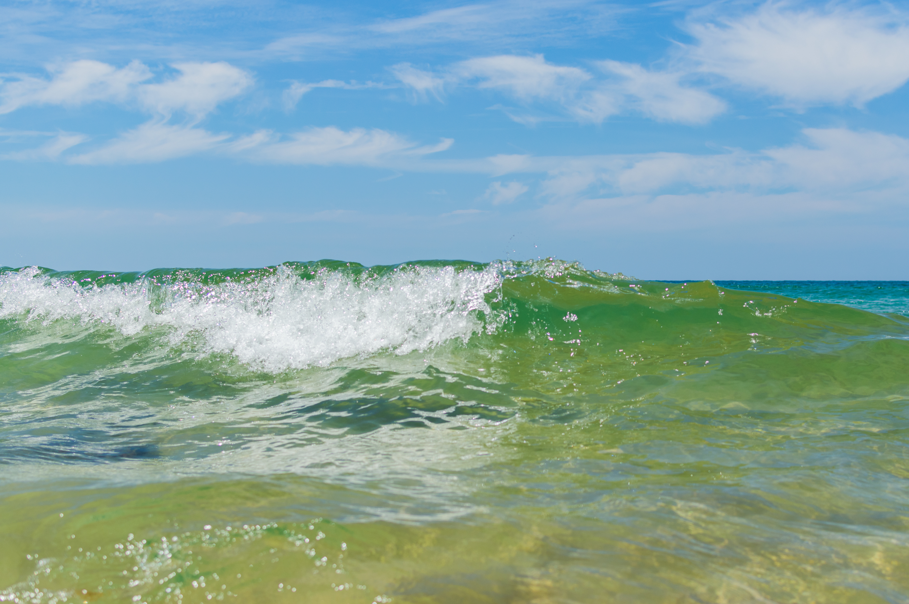 Это завораживающее изображение представляет собой динамичный крупный план тропической океанской волны, разбивающейся с мощью и яркими оттенками. Сцена разворачивается под ярко-голубым небом, украшенным рассеянными белыми облаками, что указывает на идеальные погодные условия, типичные для тропического рафинада. Вода демонстрирует очаровательный зеленовато-голубой цвет, переходящий от прозрачного у поверхности к более глубоким оттенкам дальше, отражающий солнечный свет и усиливая насыщенность. Когда волна достигает пика и разбивается вперед, она создает густую белую пену, которая красиво контрастирует с окружающей жидкостью. На переднем плане можно наблюдать мельчайшие капли воды, зависающие в воздухе во время столкновения. Горизонтная линия растягивается далеко вдаль, где море встречается с небом, создавая ощущение простора и свободы.