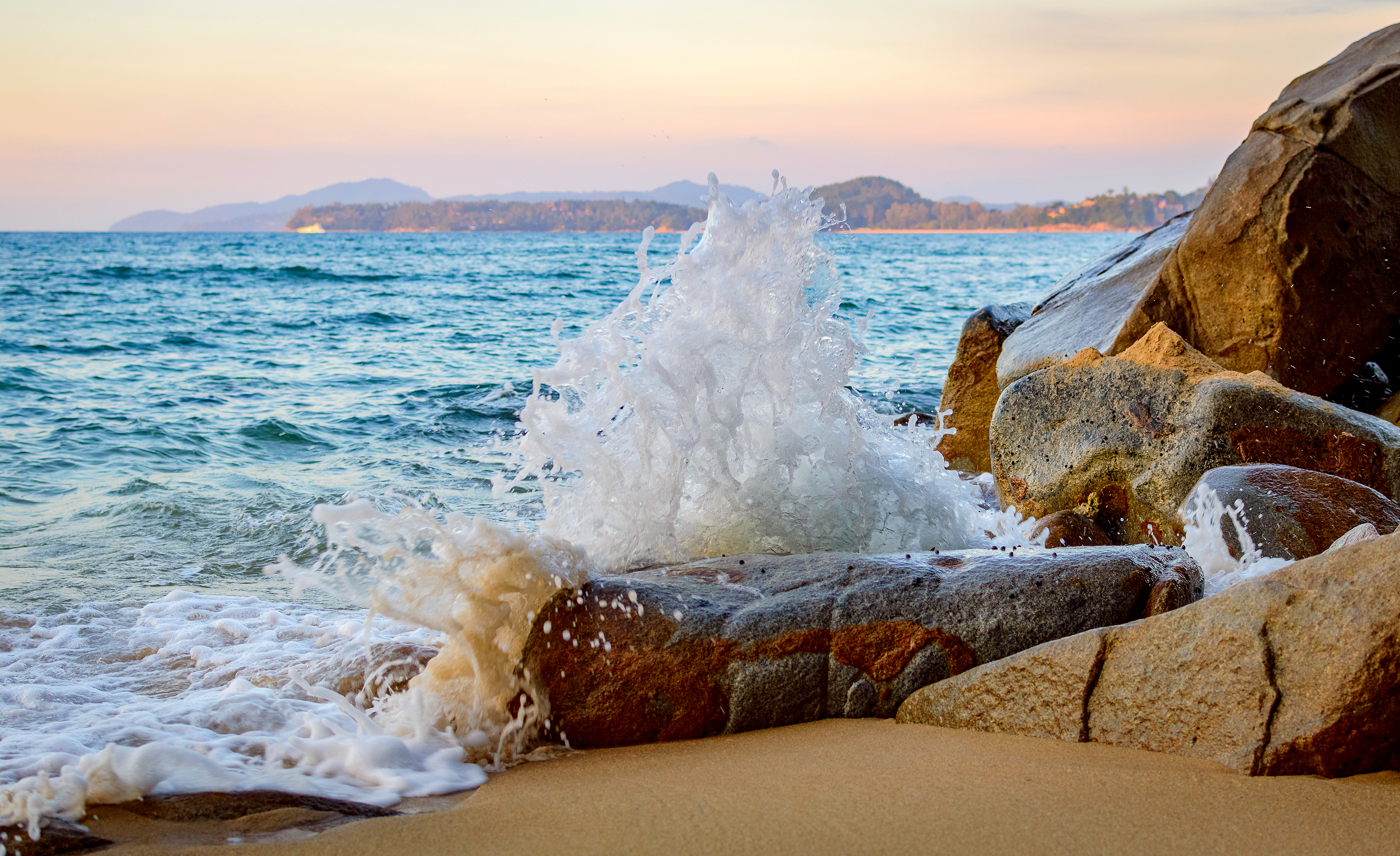 Это захватывающее изображение представляет собой драматическую волну, с силой разбивающуюся на скалистый берег во время заката. Сцена разворачивается на живописном пляже, где глубокие сине-зелёные волны превращаются в белую пену, когда сталкиваются со старыми каменными образованиями. На заднем плане горизонт и силуэты холмов очерчивают композицию под мягким градиентом неба — переливами персикового и золотого оттенков. Тёплый вечерний свет окутывает всё в эфирное сияние, подчеркивая влажные текстуры на камнях и песке, а мягкие тени добавляют глубину и объём.