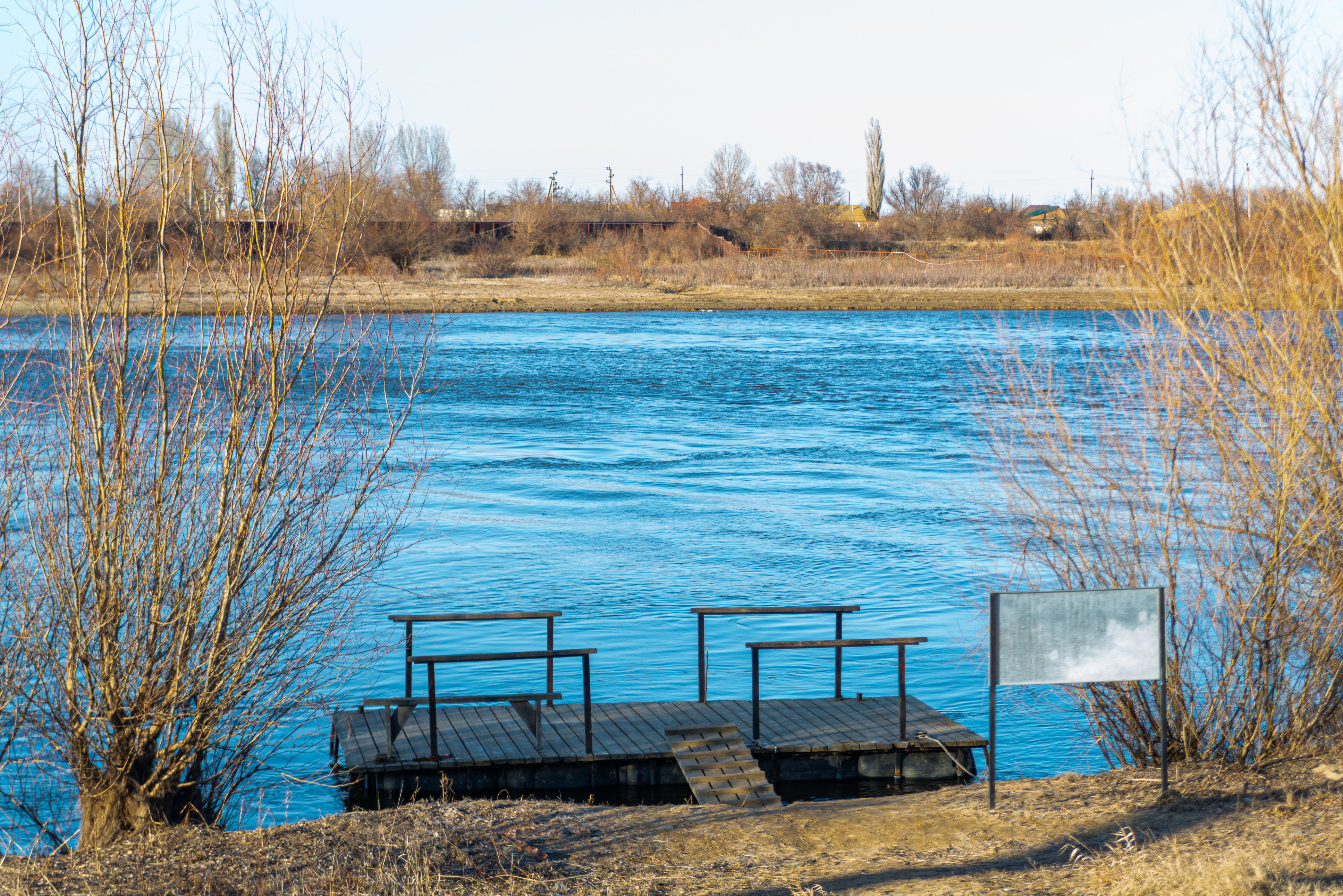 This photograph captures a wooden pedestrian pier extending gracefully into a river with strikingly vivid blue water, framed by the stark silhouette of bare winter trees. The scene is set in a quiet, open landscape under a clear, bright sky, suggesting early spring or late autumn when nature transitions between seasons. The composition draws attention to the contrast between the warm brown tones of the dry grass and earthy banks, and the cool blue hues dominating the water's surface. Geographically, this appears to be located at a riverbank in an urban or semi-rural area, possibly near pontoons as indicated by the context. The pier itself is constructed from weathered wood with simple metal railings, offering a rustic yet functional aesthetic that harmonizes with its natural surroundings. In the background, distant trees and low-lying structures hint at human presence without disrupting the tranquility of the scene.