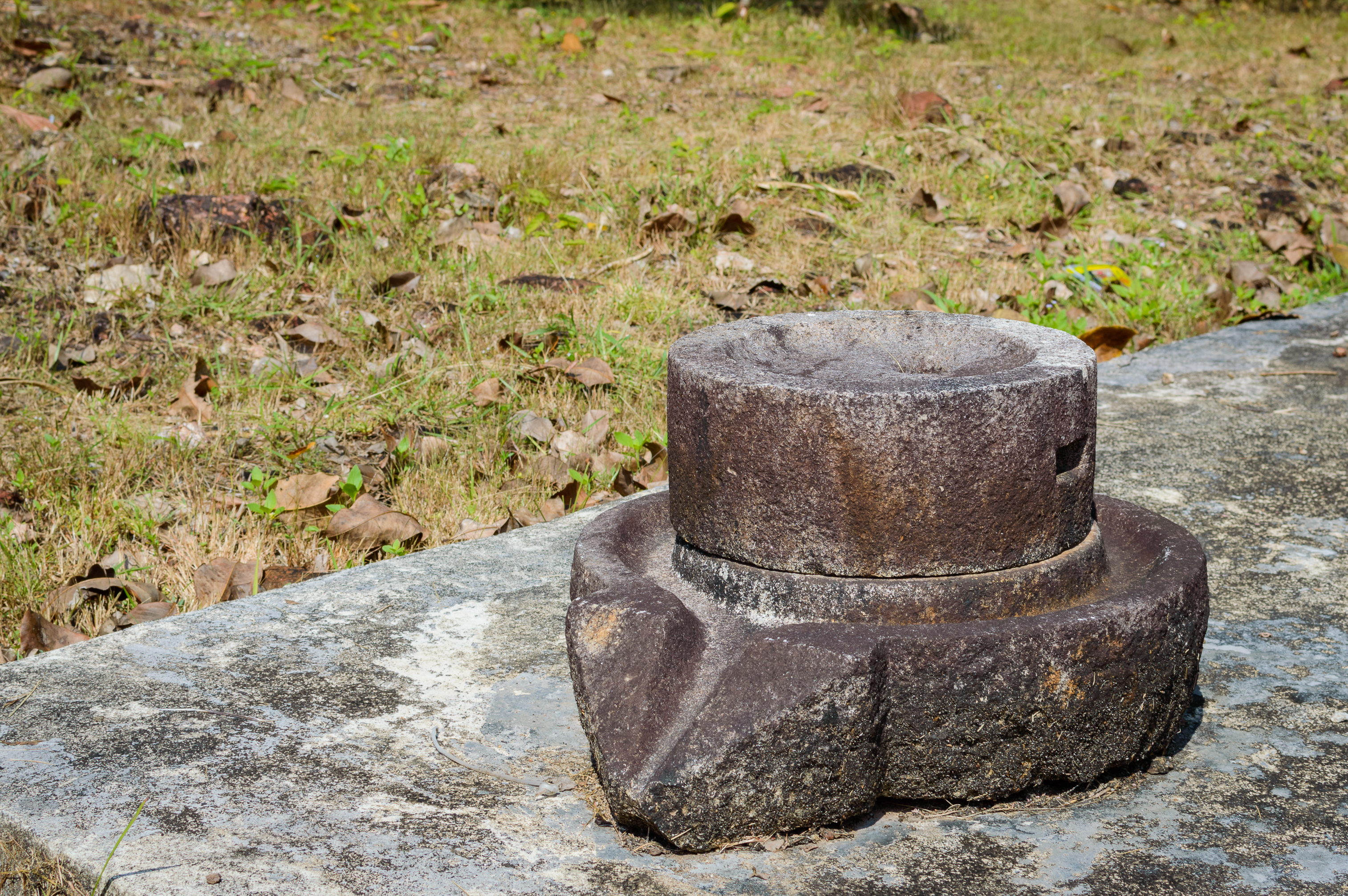 The composition centers around the cylindrical millstone, which features distinct grooves and wear patterns indicating prolonged use as an industrial tool. The stone’s dark grey surface is contrasted by the lighter mossy slab beneath it, while the blurred background of grass and soil adds depth to the image without distracting from the main subject. The lighting casts soft shadows that accentuate the artifact’s contours, revealing its aged material texture and craftsmanship details preserved through centuries.