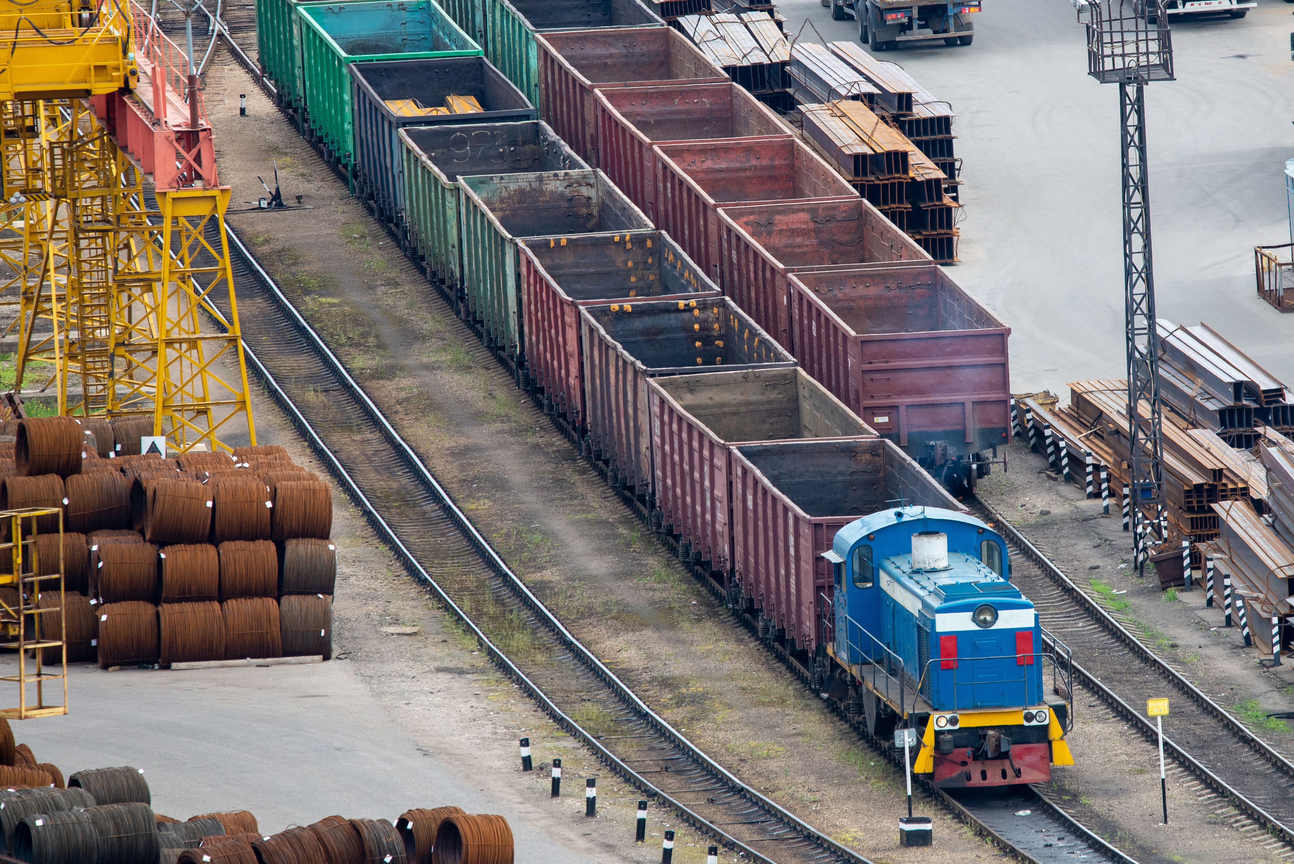 The composition is rigorously balanced: the train occupies the left side of the frame, evoking a sense of stability and permanence, while trucks positioned to the right and at various levels add dynamism and depth. The color palette combines earthy tones of metal and concrete with bright splashes of paint on truck cabs, making the scene visually rich. Lighting is soft, with gentle glints on metallic surfaces that highlight textures — from the roughness of rails to the smoothness of truck bodies. Visible details include tires, braking systems, hoses, and even reflections on windshields, adding a high degree of realism. The camera is positioned at ground level, allowing viewers to feel present in the scene, as if standing on the roadside and observing the movement.