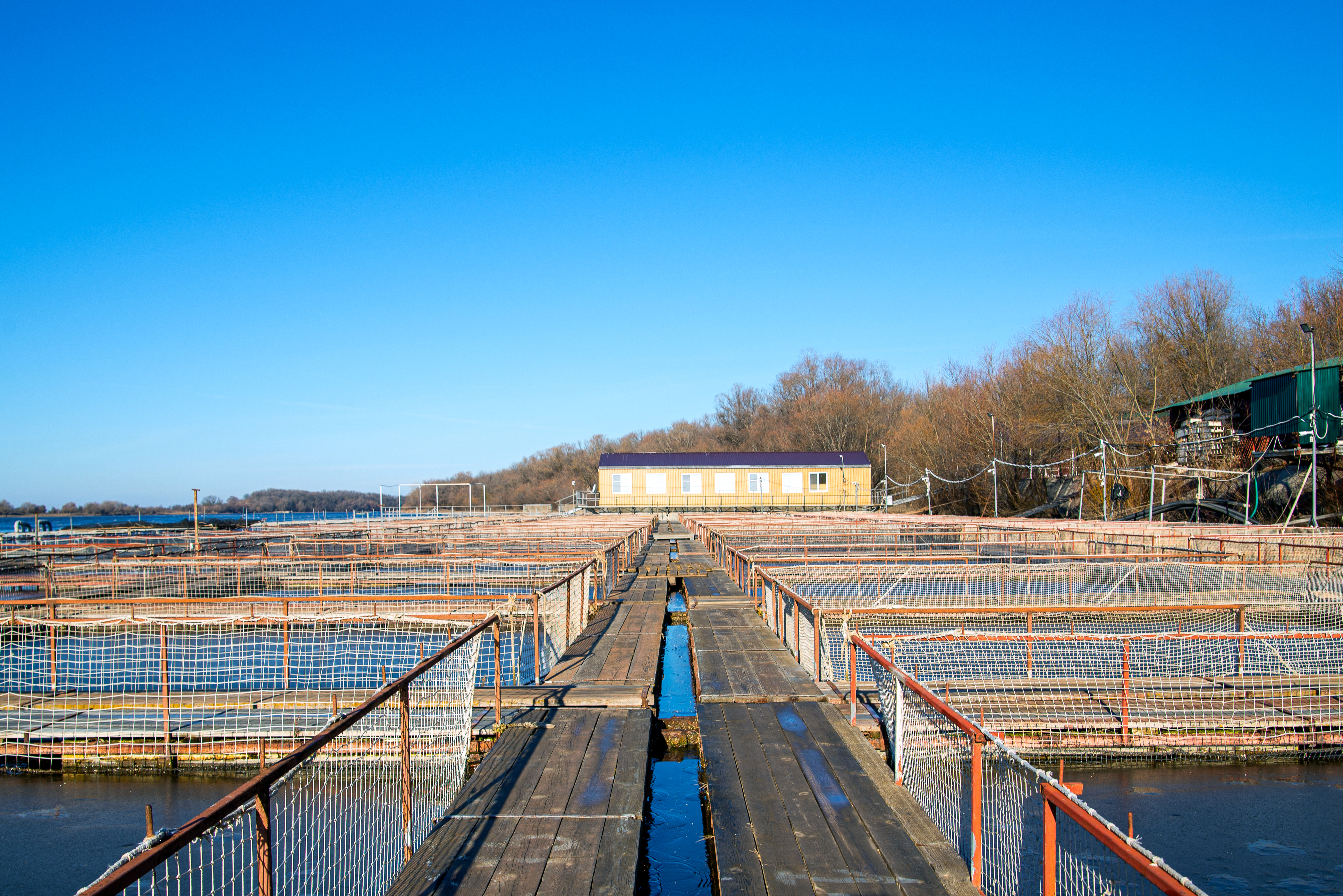 Это изображение запечатлело обширную аквакультурную зону, расположенную в тихой природной реке, представляющую собой увлекательное сочетание человеческой деятельности и неприкосновенной природы. Аквакультурная инфраструктура состоит из множества рядов больших сетчатых клеток, аккуратно выстроенных вдоль береговой линии воды, создавая ритмичный узор, который привлекает взгляд к горизонту. Деревянная дорожка проходит через центральную часть кадра, служа как функциональным путем для рабочих, так и сильным композиционным элементом, ведущим зрителей глубже в сцену. Вдалеке находится скромное желтое здание с фиолетовой крышей, возможно, служащее административным или техническим помещением, которое едва заметно контрастирует с окружающей средой. Вода реки кажется спокойной под ярким дневным светом, отражая безоблачное голубое небо над всем этим комплексом. На обоих берегах оголенные лиственные деревья указывают на раннюю весну или позднюю осень — сезоны, когда природа находится в переходе, а человеческое вмешательство становится более заметным. Общий вид вызывает чувство спокойной трудовой деятельности, демонстрируя, как современные сельскохозяйственные практики могут сосуществовать с естественными рековыми экосистемами.