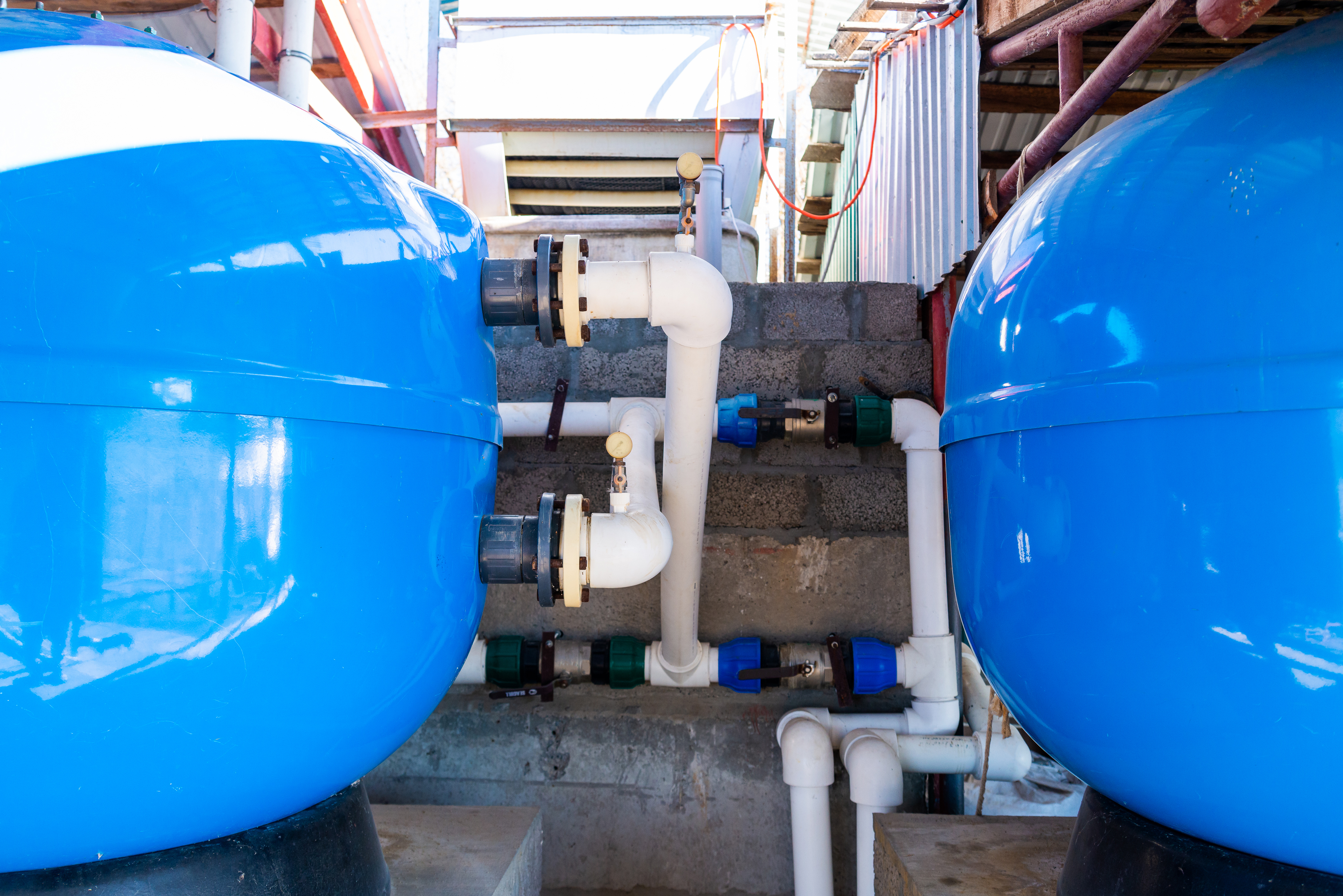 This image captures a close-up view of two large, glossy blue industrial water storage tanks connected by an intricate network of white PVC pipes and valves. The setting appears to be an indoor utility or technical facility, possibly part of a larger factory or commercial infrastructure. Bright daylight streams through windows or openings in the background, casting sharp reflections on the smooth surfaces of the tanks and illuminating the entire system with clarity. The composition is anchored by the symmetrical placement of the two tanks flanking the central pipe structure, which rests against a rough concrete wall.