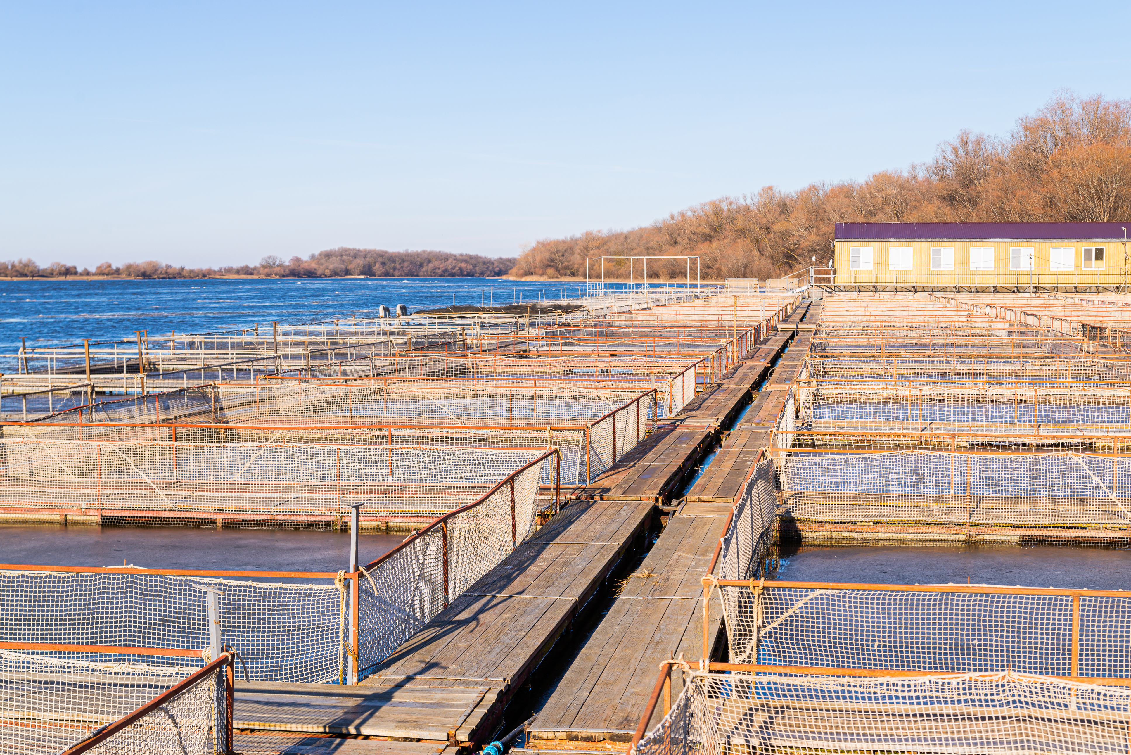 This image captures a sprawling industrial sturgeon fish farm situated on the edge of a large, calm lake under a clear blue sky. The facility consists of numerous rectangular net pens arranged in neat rows, connected by long wooden walkways that allow for easy access and monitoring of the aquatic environment. A small yellow building with a purple roof stands prominently at the far end, likely serving as an administrative or processing center. Surrounding the farm is a forested shoreline with bare trees, suggesting late autumn or early winter conditions. The scene reflects the scale and organization of modern aquaculture operations designed for commercial breeding of sturgeon. The bright sunlight casts clear shadows across the wooden planks and metal netting, enhancing the textures of rusted metal frames and weathered wood.