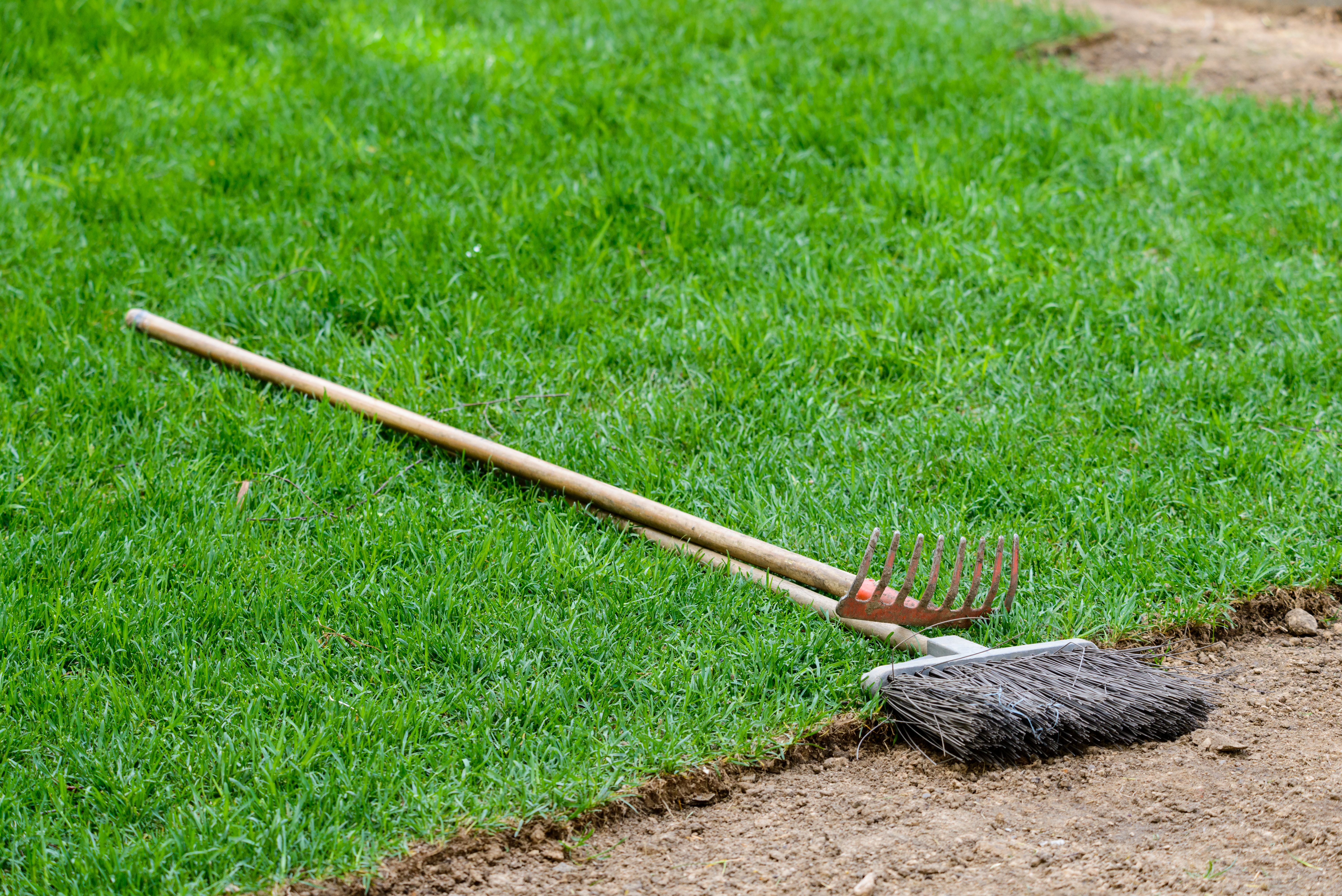 Tools, rake and broom on the lawn