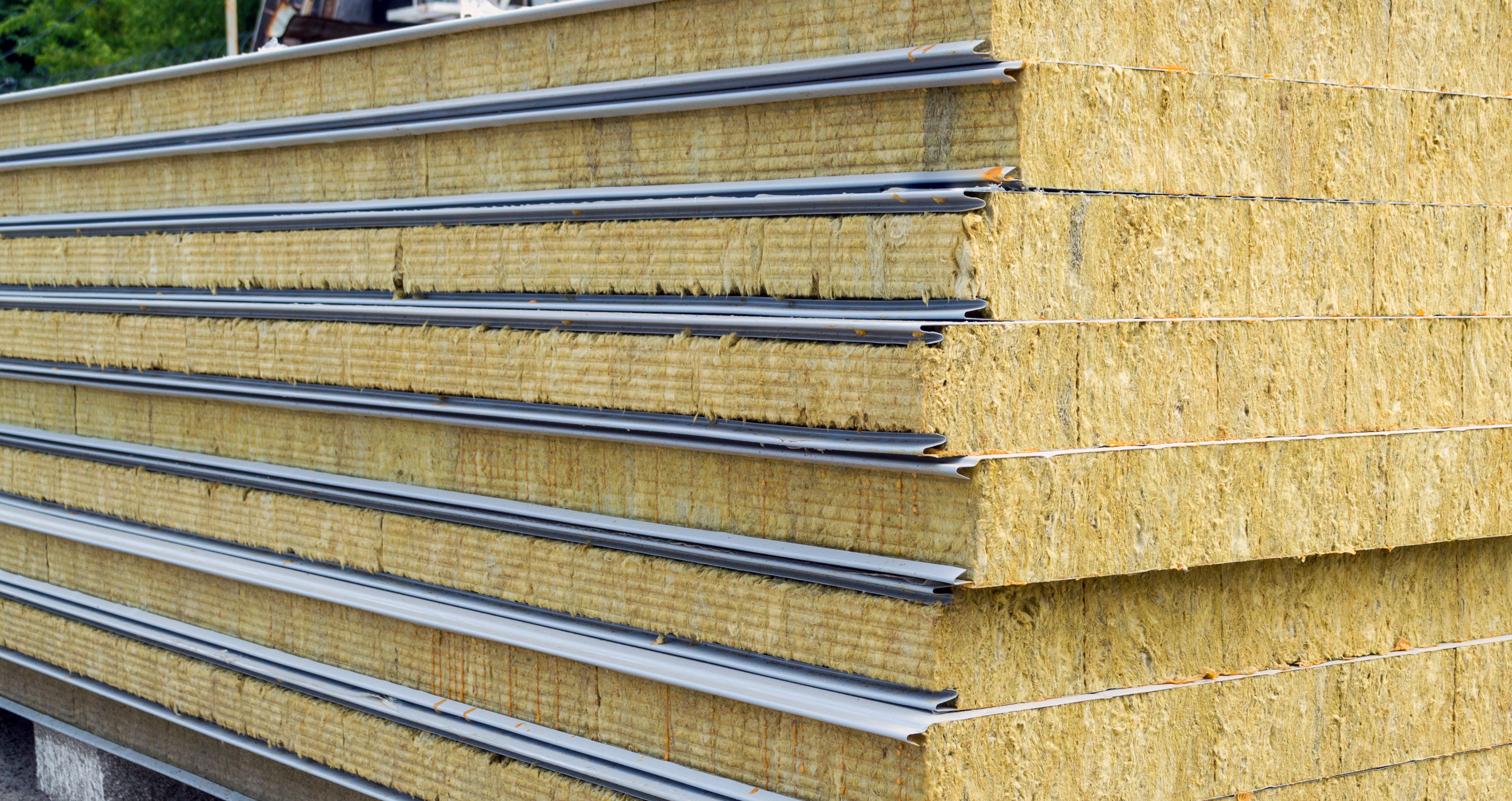 На изображении представлены аккуратно уложенные в стопку сэндвич-панели, предназначенные для строительства. Этот современный строительный материал обладает многослойной структурой, где в качестве утеплителя используется минеральная вата, заключенная между двумя металлическими или пластиковыми облицовками. Желтоватый цвет утеплителя ярко выделяется на фоне серых металлических профилей, которые соединяют панели друг с другом, обеспечивая их устойчивость и готовность к монтажу.