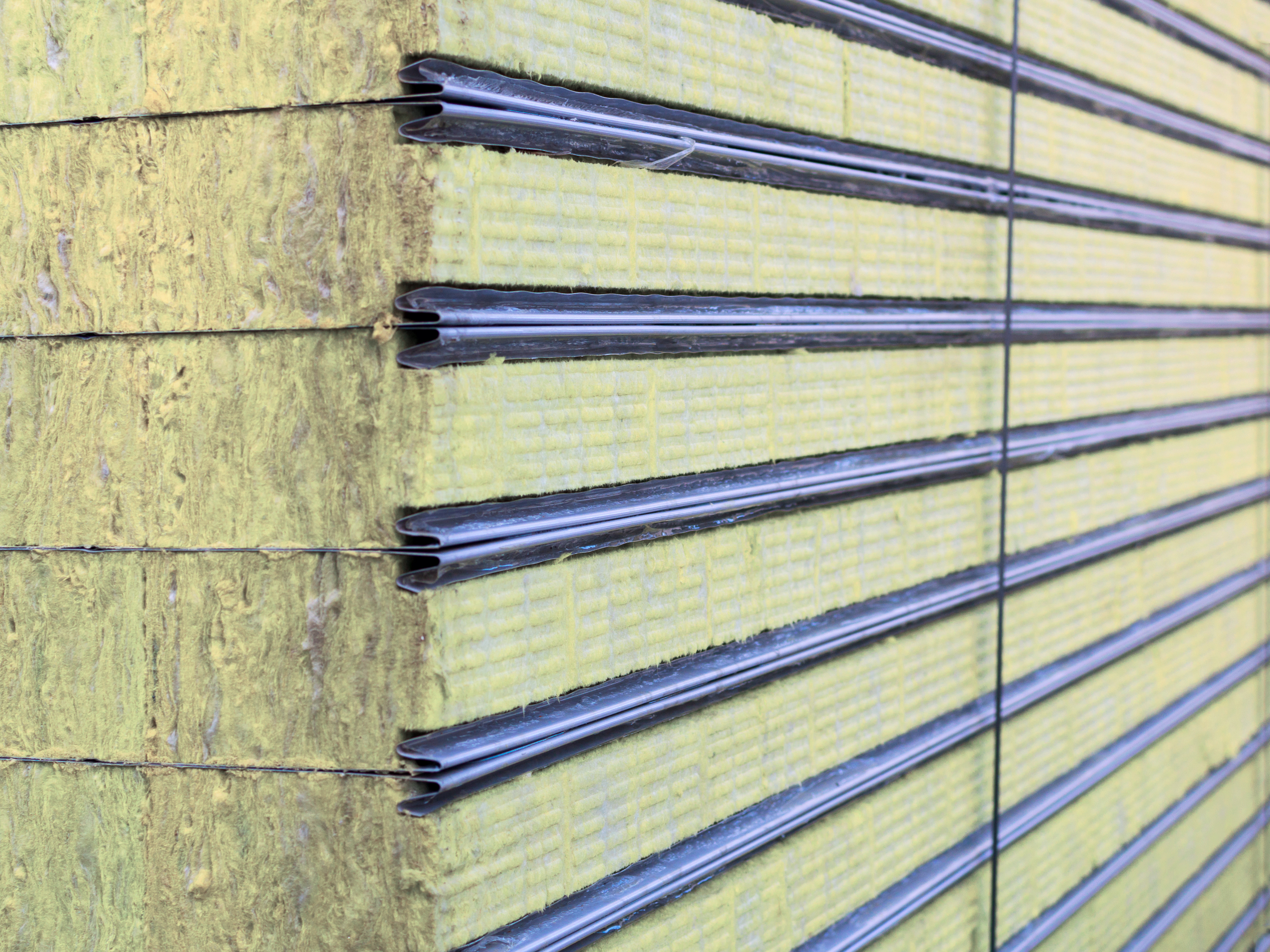 Панели уложены ровно, образуя геометрически правильную композицию. Видна текстура минеральной ваты — волокнистая и пористая, что указывает на ее теплоизоляционные свойства. Металлические элементы, вероятно, выполненные из оцинкованной стали, имеют форму, обеспечивающую надежное соединение панелей друг с другом, создавая герметичную и прочную конструкцию.