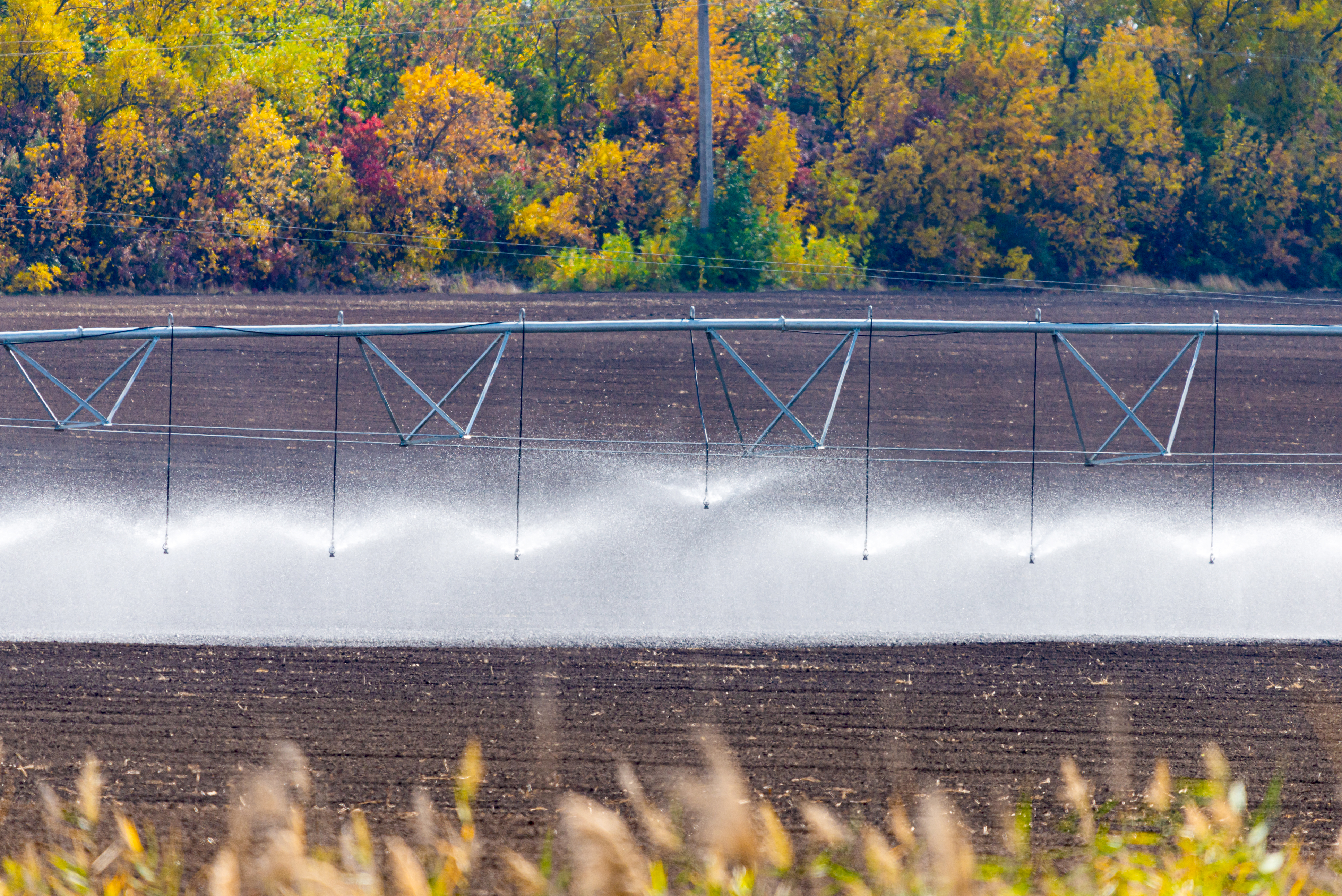 This captivating photograph captures a modern center pivot irrigation system actively watering an expansive agricultural field during the peak of autumn. The scene unfolds under clear skies, with sunlight enhancing the rich textures of dark brown plowed soil and contrasting sharply against the vibrant canopy of trees in the background displaying brilliant hues of yellow, orange, red, and purple foliage. In the foreground, blurred golden grasses add depth and a sense of perspective to this rural panorama. The mechanical structure, composed of sturdy metal arms and pipes, spans horizontally across the frame, its numerous sprinklers releasing fine mist that glistens in the sunlight, symbolizing the life-giving essence of agriculture. This image represents the intersection of advanced technology with timeless natural beauty, highlighting how human ingenuity supports food production while harmonizing with seasonal changes.