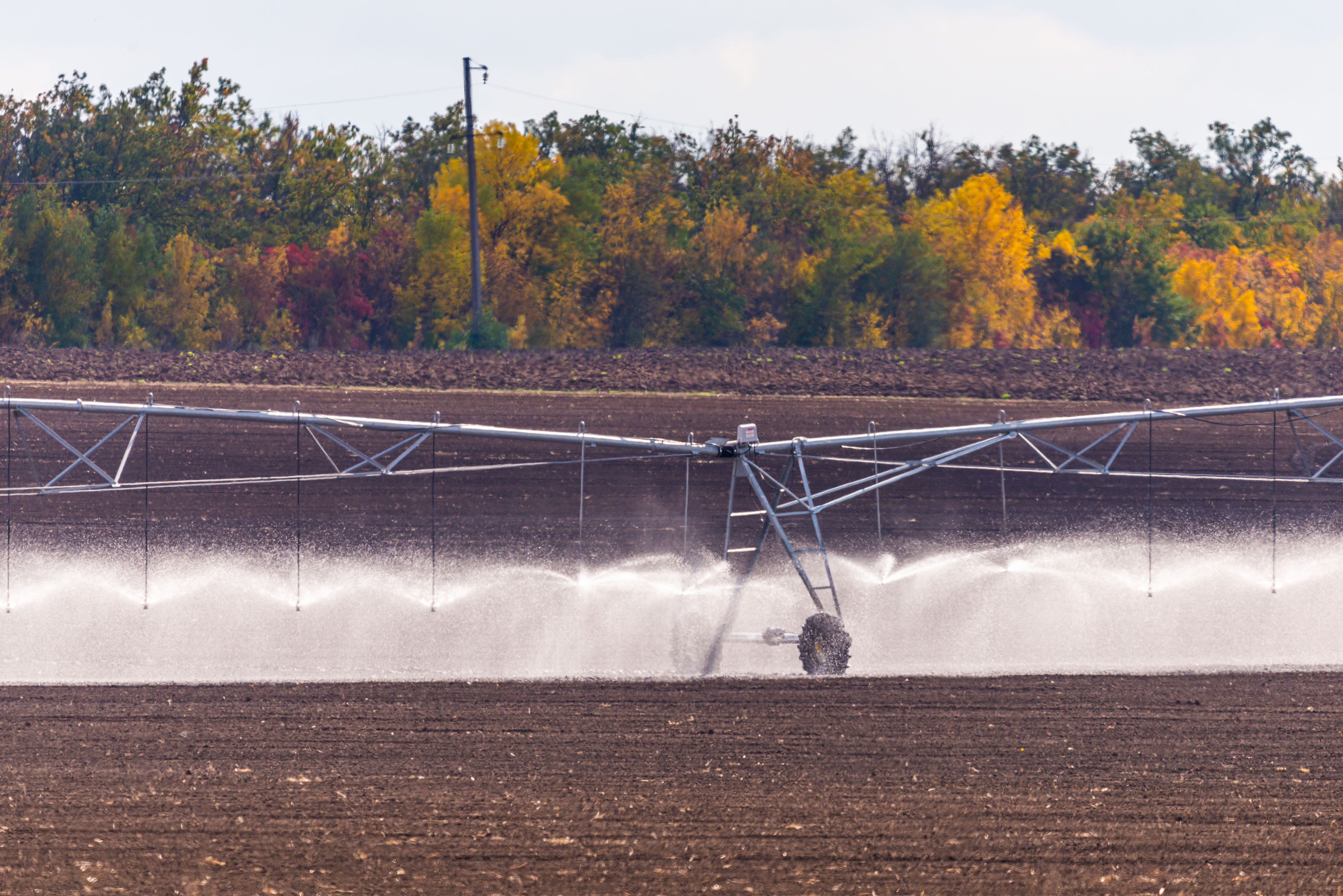 This photograph captures a modern center pivot irrigation system actively watering an expansive agricultural field during the autumn season. The machinery, composed of sturdy metal arms and sprinkler heads, moves methodically across the dark, tilled soil, spraying water in rhythmic arcs that glisten under diffused natural light. In the background, a dense line of trees displays vibrant fall colors — golden yellows, deep reds, and rich greens — creating a striking contrast with the industrial steel structure in the foreground. The sky is overcast, casting soft shadows and enhancing the earthy tones of the field. This scene represents the intersection of advanced agricultural technology and natural seasonal beauty, highlighting sustainable farming practices that ensure crop health during critical growth stages.