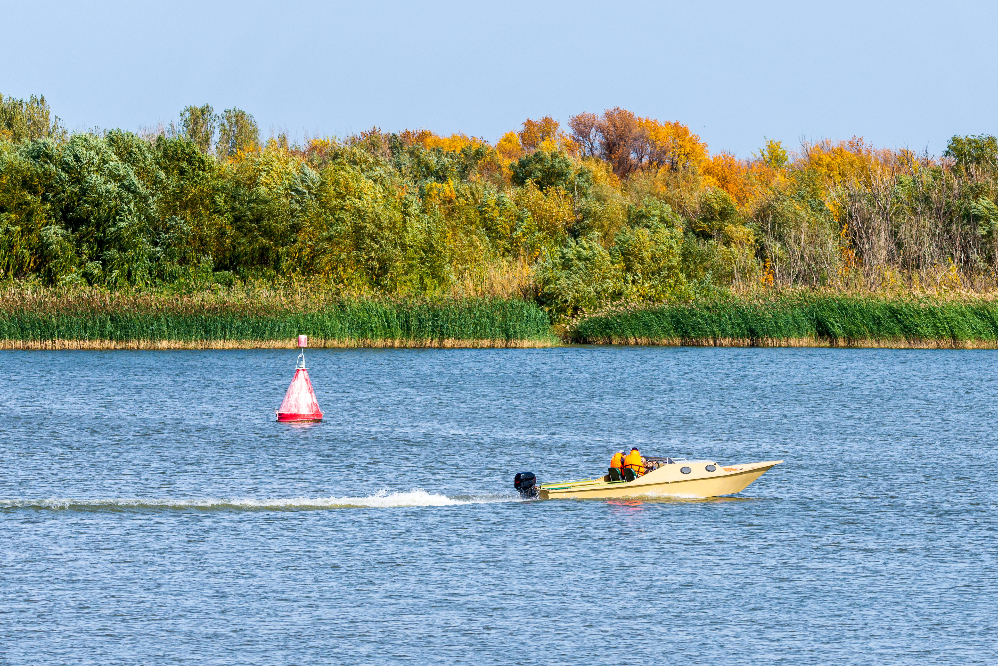 A motor boat with two occupants speeds across a tranquil river, creating a distinct white wake as it cuts through the calm blue water. The scene is set in autumn, evidenced by the vivid yellow and orange foliage of trees lining the distant riverbank, contrasted against patches of green reeds near the shore. A red buoy floats peacefully nearby, adding a pop of color to the serene waterscape. The sky above is clear and bright, suggesting a sunny day that enhances the natural beauty of the environment. This image captures not just movement but also tranquility — the gentle motion of the boat against the stillness of nature.