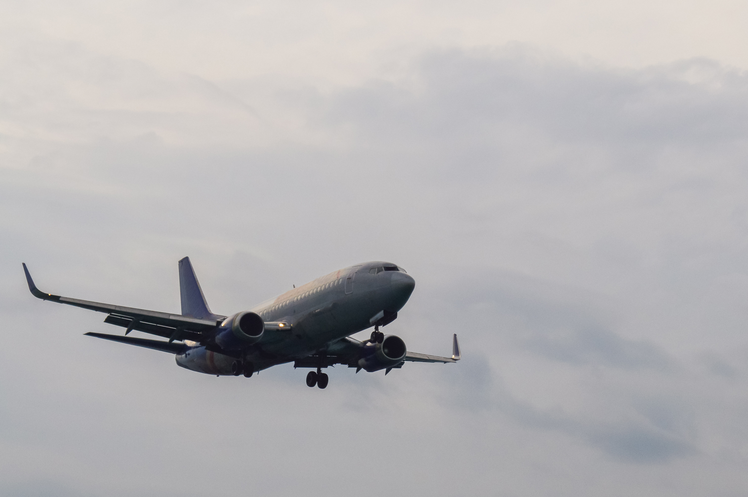 Это захватывающее изображение представляет собой коммерческий самолет, запечатленный в полете на фоне огромного облачного неба, наполненного мягкими, рассеянными облаками. Самолет расположен немного смещено от центра кадра, что создает визуальное равновесие и привлекает внимание зрителя вдоль его гладкого металлического корпуса в сторону горизонта. Шасси явно опущены, указывая на предстоящую посадку — что добавляет ощущение ожидания и движения сцене. Преобладают приглушенные серые тона, отражающие пасмурную погоду и усиливающие спокойное, но динамичное настроение. Освещение мягкое и равномерное, без резких теней, что подчеркивает гладкую текстуру металлической обшивки самолета и акцентирует его аэродинамическую форму.