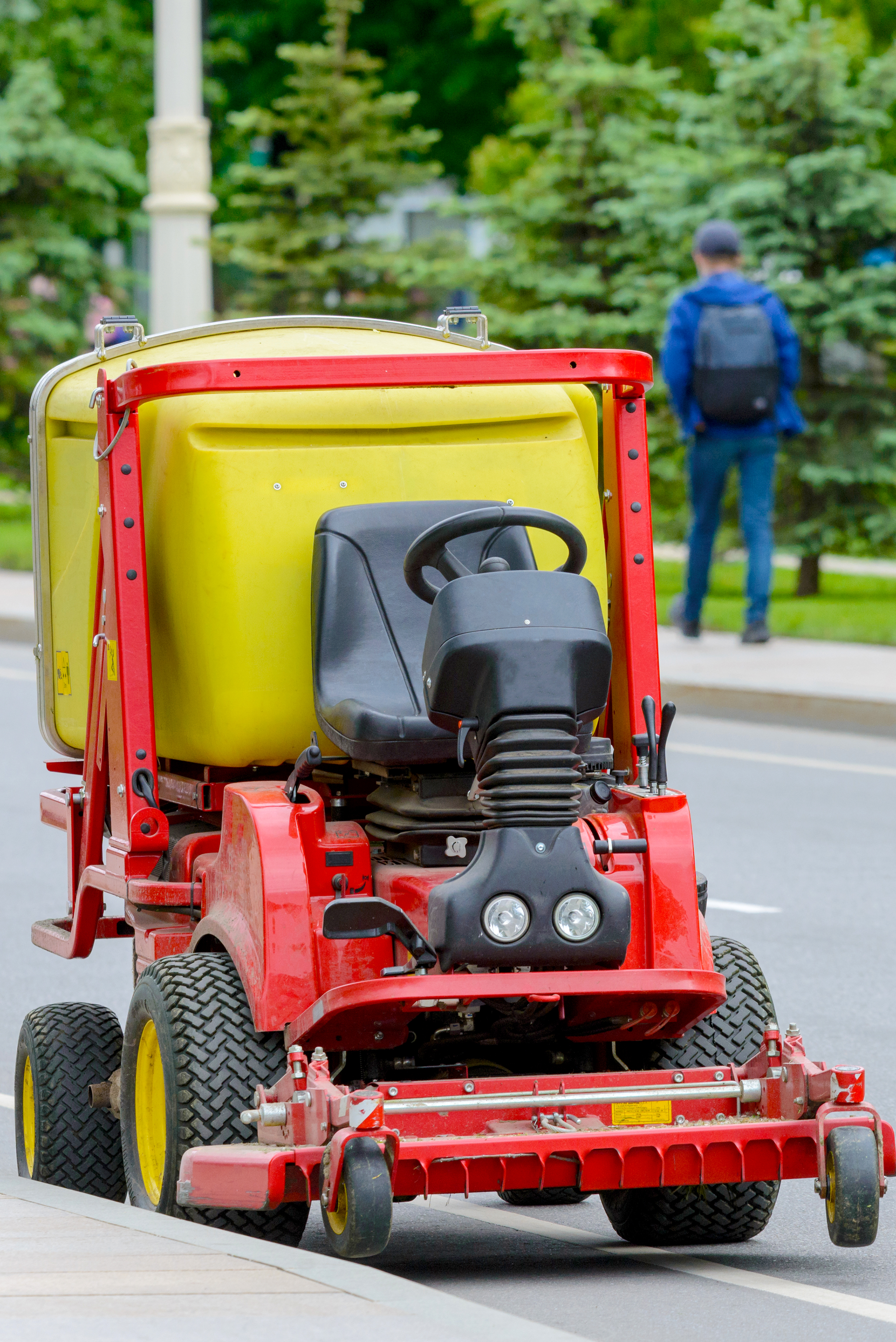 На снимке запечатлена газонокосилка, стоящая на асфальтированной дорожке в сердце городского парка, где вдалеке виднеются силуэты деревьев и зданий, создающие контраст между природой и архитектурой. Сцена снимается в ясный солнечный день, когда солнечные лучи мягко падают на металлические поверхности машины, подчеркивая её гладкие формы и яркие цвета. Газонокосилка, окрашенная в насыщенный красный и желтый, выделяется на фоне серого асфальта и зеленой листвы, словно рекламный элемент в живописном пейзаже. Вокруг неё — тихая атмосфера утреннего или вечернего парка, где лишь слышны шелест листьев и отдалённые шаги посетителей. Снимок передает ощущение уюта, порядка и ухода за пространством, а также техническую эстетику современного садового оборудования.