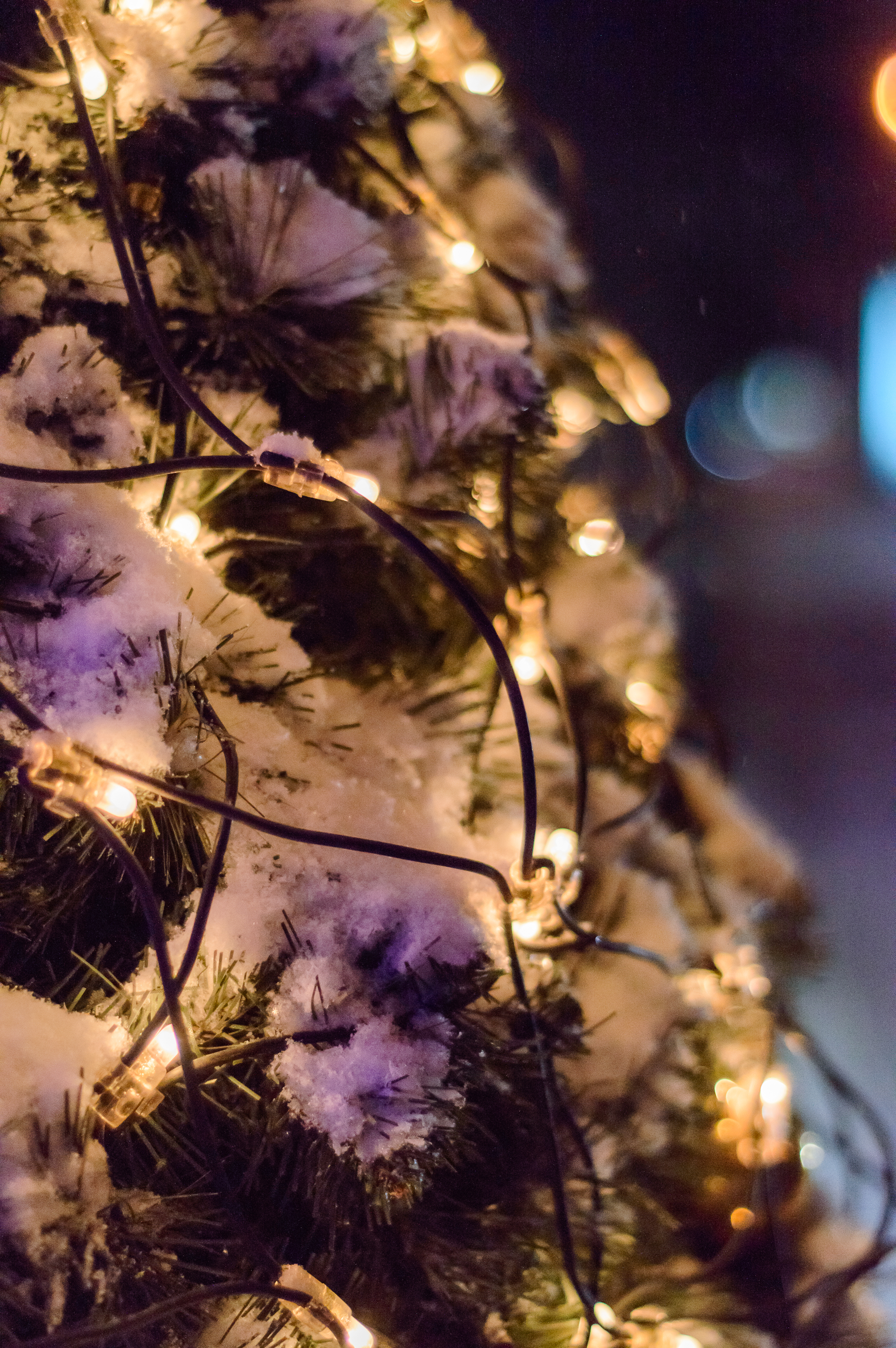 Изображение мастерски составлено, чтобы привлечь внимание к взаимодействию между природными элементами и человеческими украшениями. Каждая группа огней подчёркивает сложную структуру дерева, а тени от проводов добавляют глубину и объём. Снег кажется пушистым и чистым, прилипая к каждой иголке с хрустальным блеском, который поймал свет. Незаметные фиолетовые оттенки от удалённого фонового освещения слабо окрашивают часть снега, добавляя ещё один слой визуального интереса. Мелкий глубокий резерв выделяет объект чётко на фоне мечтательной обстановки, создаёт ощущение интимности и фокусируется на тонкой красоте зимних праздничных традиций.