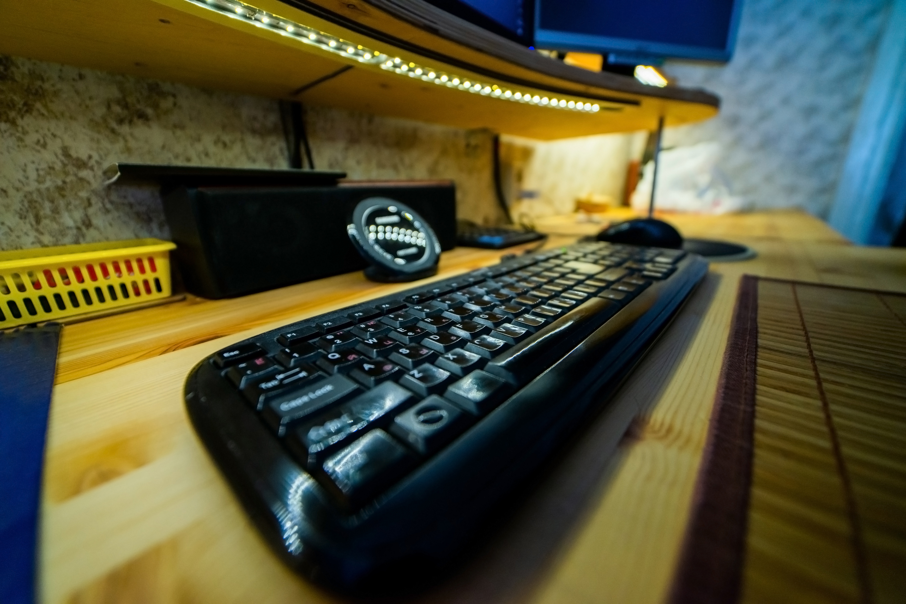 The image showcases a cozy and functional workspace, focusing on details. At the center of the composition is a black keyboard made of glossy plastic, reflecting light and creating a sense of depth. The keys with a clear layout, showing both Russian and English letters, invite interaction.