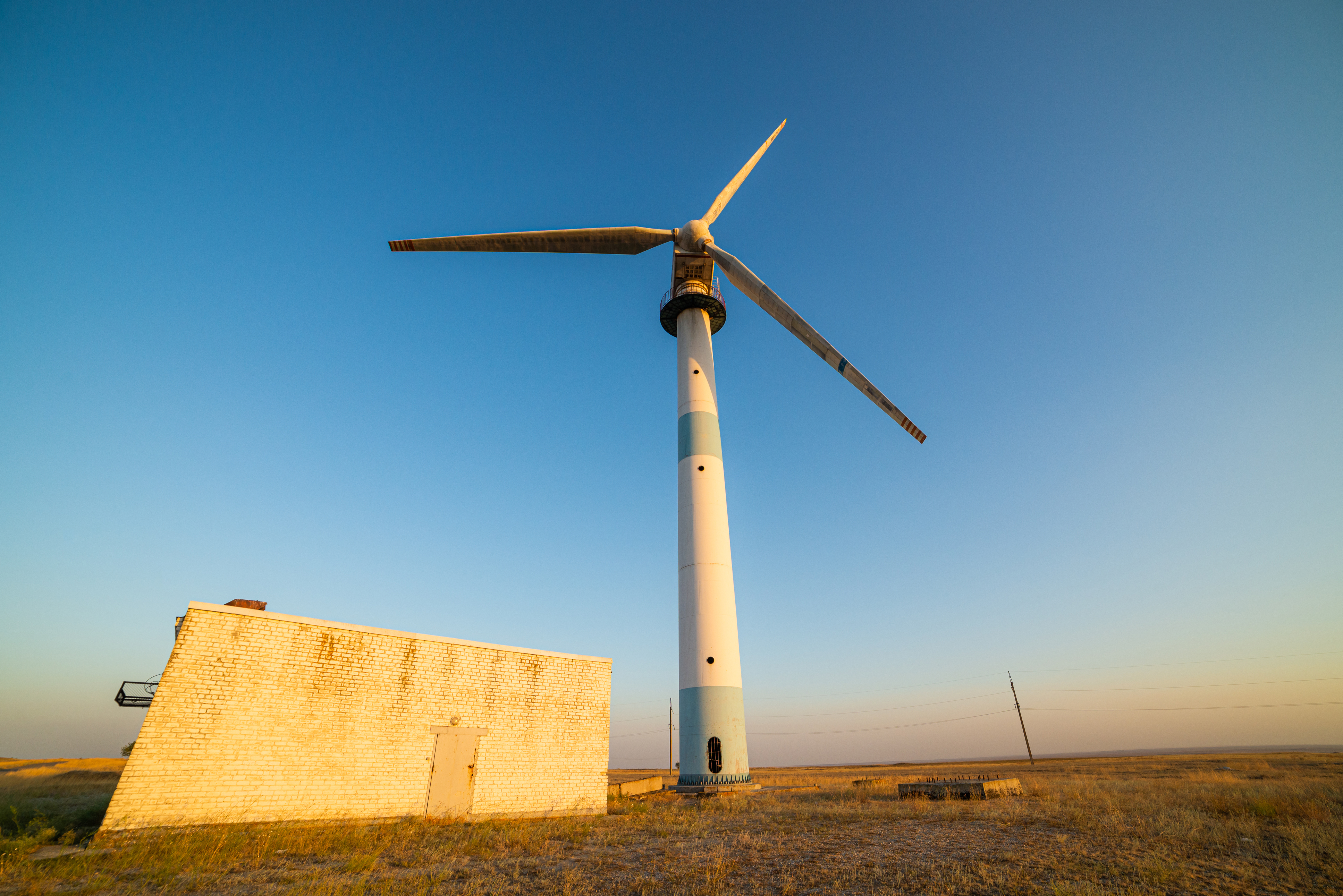 This image portrays a solitary, abandoned wind turbine standing in the heart of an expansive desert landscape under a vast, clear blue sky. The setting sun casts a warm golden glow across the scene, highlighting the textures and weathered surfaces of both the turbine's white-and-blue tower and its adjacent brick building. The horizon stretches endlessly into the distance, emphasizing the isolation and quiet beauty of this forgotten piece of renewable energy infrastructure. This location appears to be remote, possibly in an arid region where wind power once promised a sustainable future but now stands as a relic of industrial ambition.
