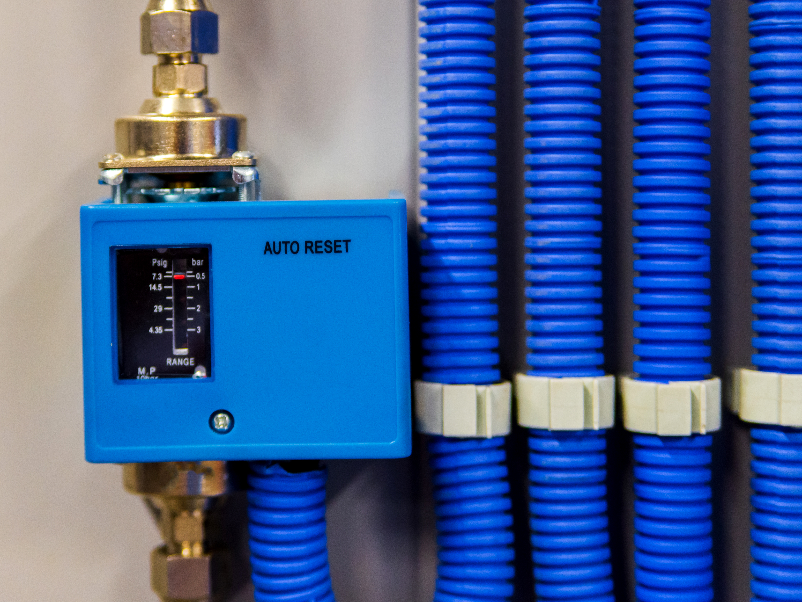 На фотографии представлен крупный план современного синего датчика давления, играющего важную роль в системах водоснабжения и автоматизации промышленных процессов. Камера фокусируется непосредственно на устройстве, позволяя рассмотреть мельчайшие детали его конструкции. Фон размыт, что акцентирует внимание зрителя именно на ключевом объекте – датчике. Ощущается атмосфера технического прогресса и надежности, характерная для современного инженерного оборудования. Композиция выстроена таким образом, чтобы показать взаимосвязь датчика с окружающей средой: видны водопроводные трубы, к которым он подключен, что указывает на его функциональное назначение в системе подачи воды. Время суток не определено, но естественное освещение создает ощущение нейтральности и объективности изображения, подчеркивая технический характер объекта съемки. В целом, фотография передает впечатление о точности, эффективности и важности данного устройства для обеспечения бесперебойной работы инженерных систем.