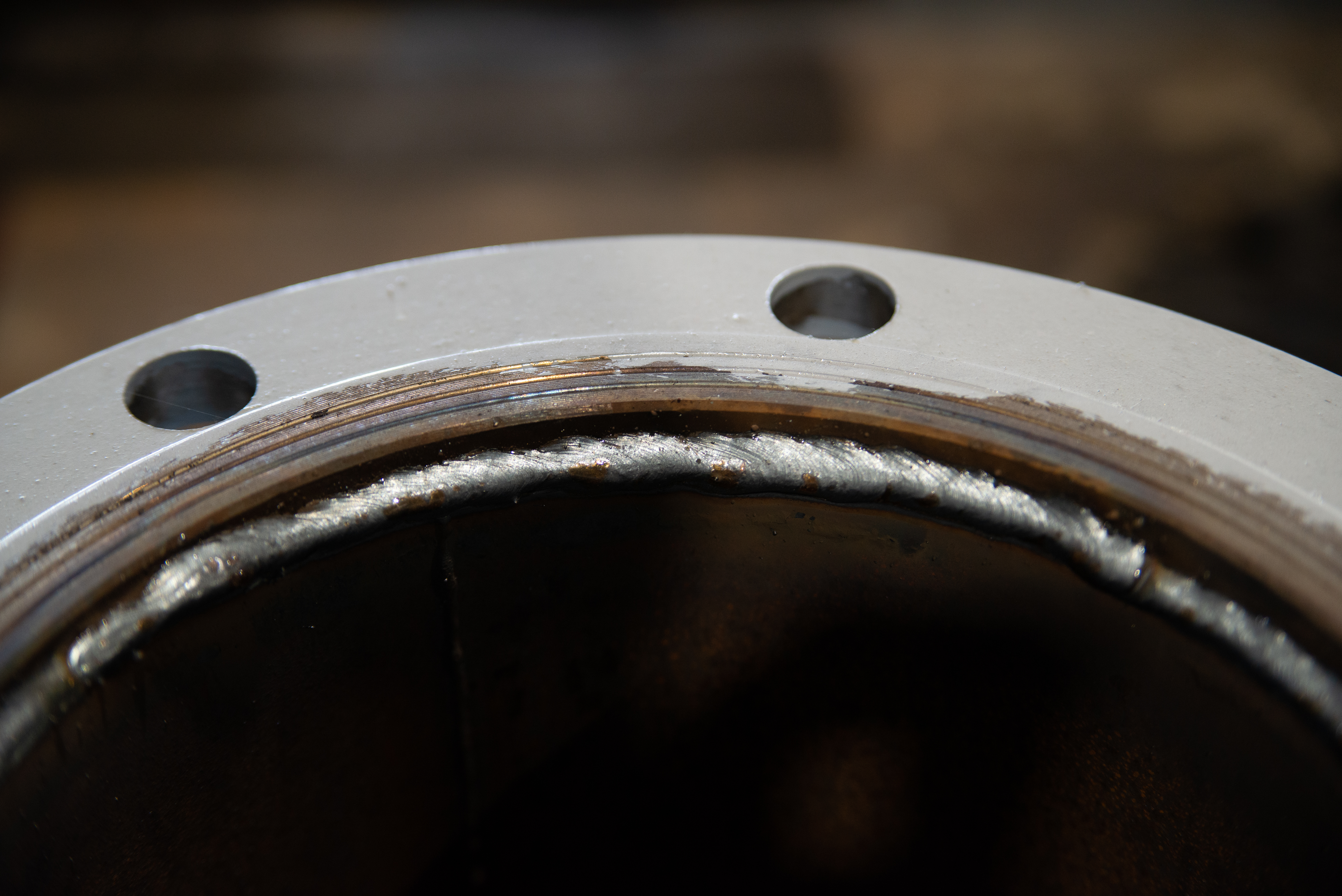 Внутренняя часть фланца, где проходит сварной шов, имеет более темный, почти черный цвет, что создает контраст с внешним светлым покрытием. Эта область выглядит более матовой и текстурированной.