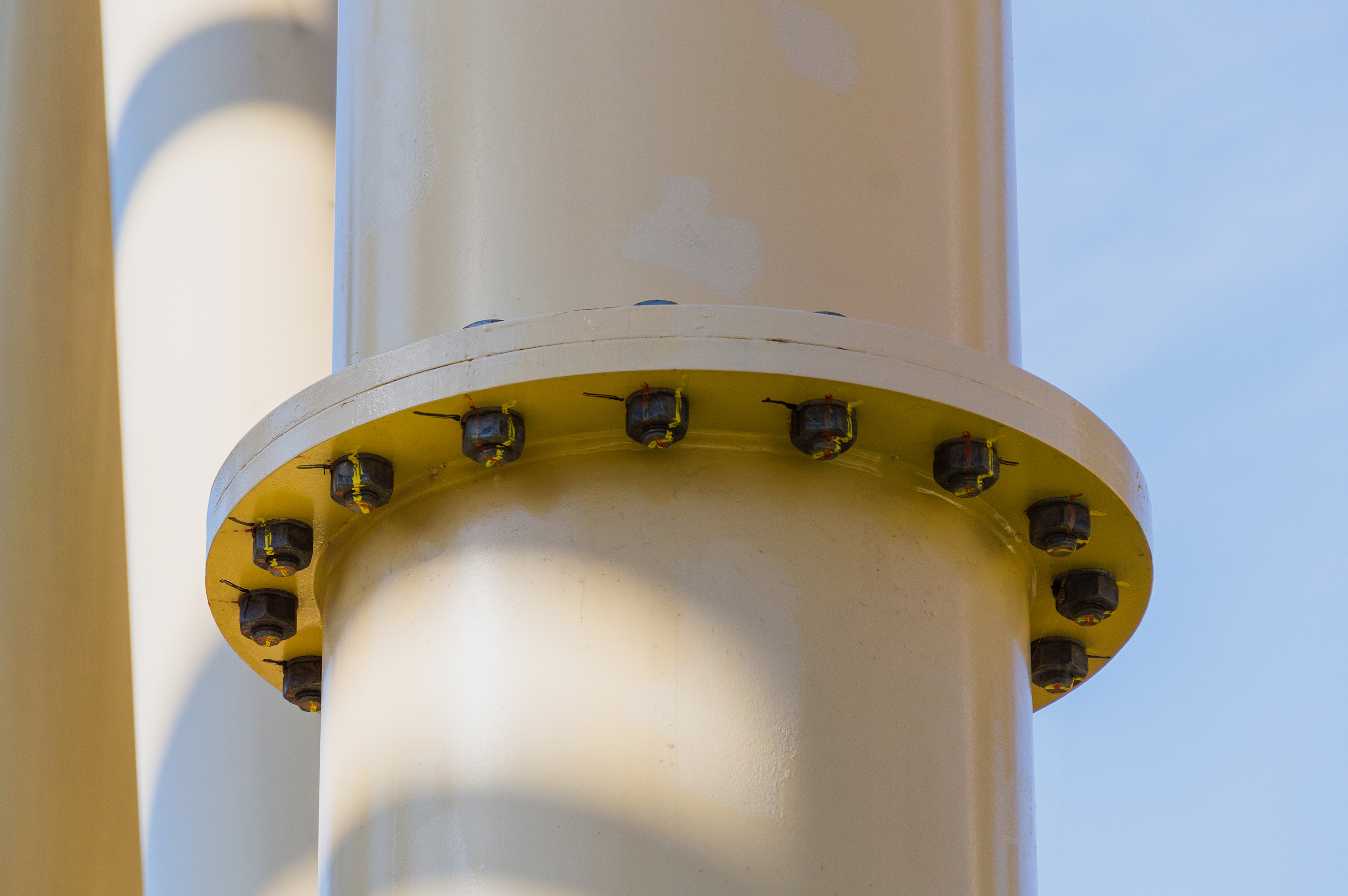 This image is a close-up of a detail of an industrial pipeline, focusing on the connection between two pipe sections. A massive flange, painted in a bright yellow color that contrasts with the main beige color of the pipes, takes center stage. The flange fits snugly against the main pipe, and its edges are adorned with numerous bolts and nuts, securely fastening the structure. Some of the bolts have bright yellow markings, likely applied for tightening control or labeling.