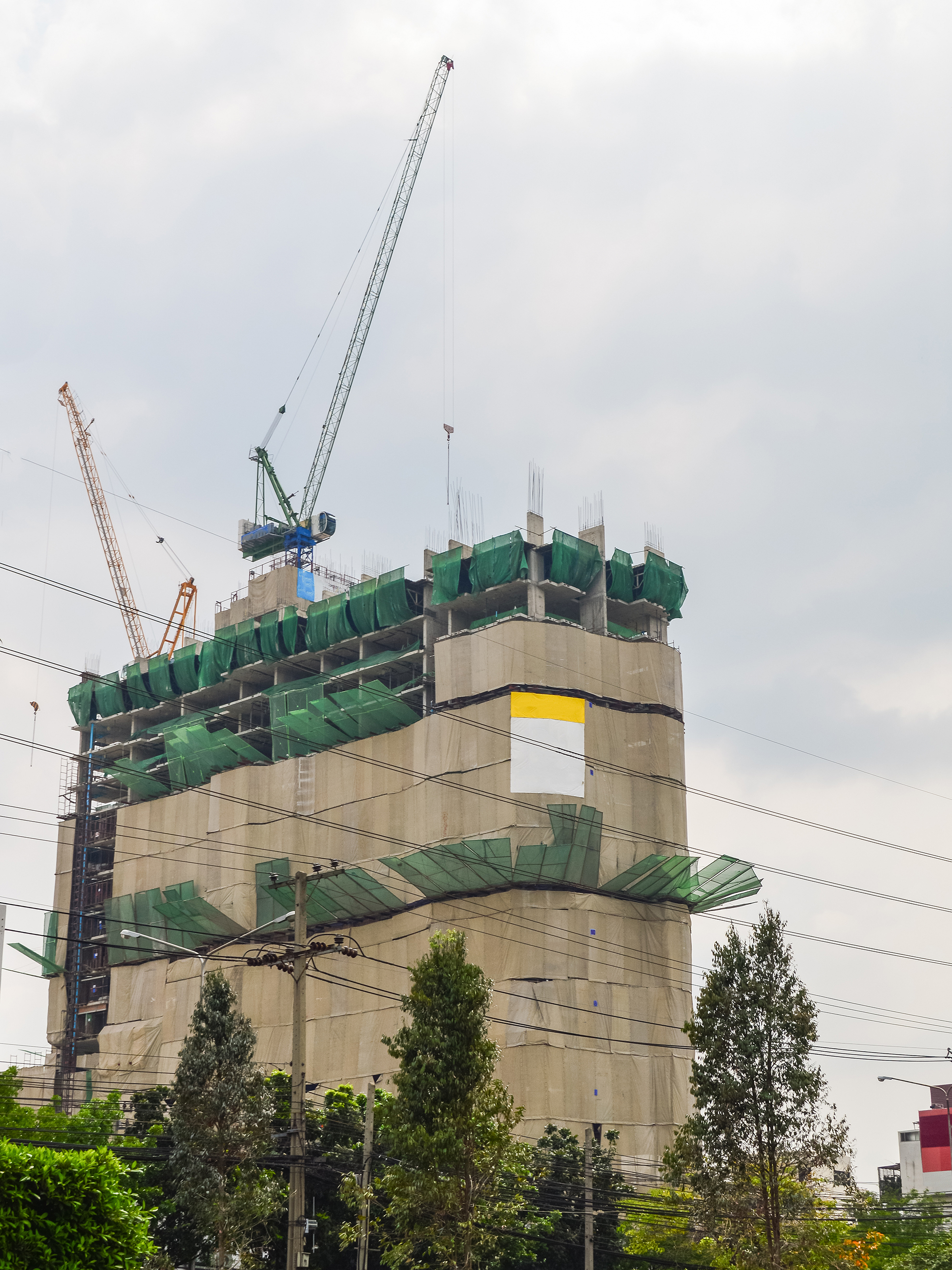 This image captures a bustling urban construction site dominated by a high-rise building in its early stages of development, surrounded by towering cranes that signify ongoing industrial activity. The structure features exposed concrete walls and floors, partially covered with green safety netting to protect workers and the public from falling debris. Multiple cranes — including one large blue crane and another orange crane — are positioned strategically around the site, their long arms extending into the overcast sky above. Power lines crisscross the frame in front of the building, adding a sense of urban complexity and infrastructure density. In the foreground, lush green trees partially obscure the view, creating a natural contrast against the stark industrial backdrop. The weather is cloudy with diffused lighting, casting soft shadows across the scene.