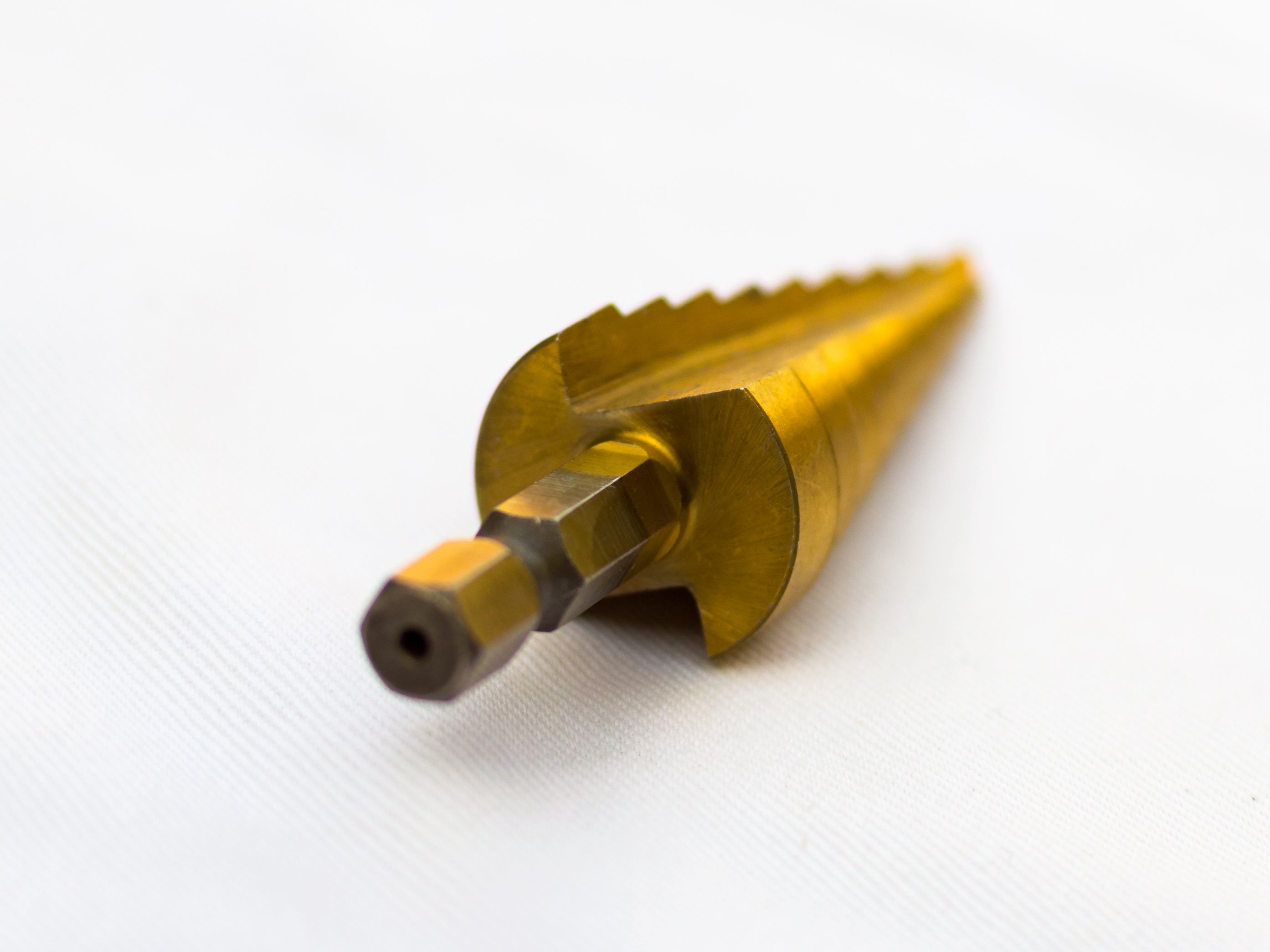 This image showcases a high-quality gold step drill bit, positioned on a smooth, textured white surface. The drill bit is in sharp focus, its gleaming golden surface reflecting light, emphasizing its durability and precision.
