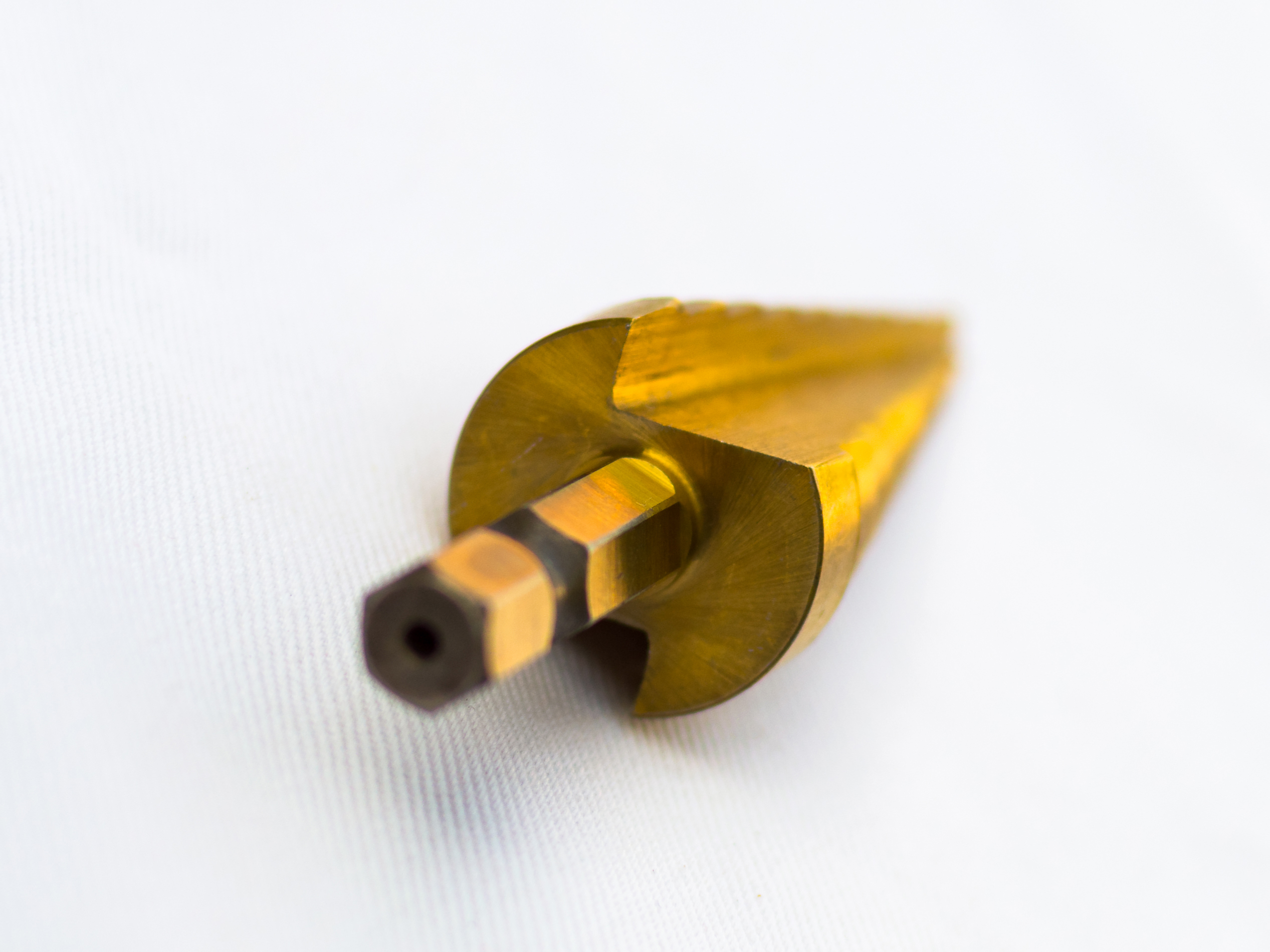 Это изображение представляет собой детальную макросъемку ступенчатого сверла, выполненного в золотистом оттенке. Инструмент расположен на чистом, нейтральном белом фоне, что позволяет полностью сосредоточить внимание зрителя на его форме и текстуре. Сверло имеет характерную конусообразную форму с несколькими ступенями, каждая из которых предназначена для создания отверстий разного диаметра.