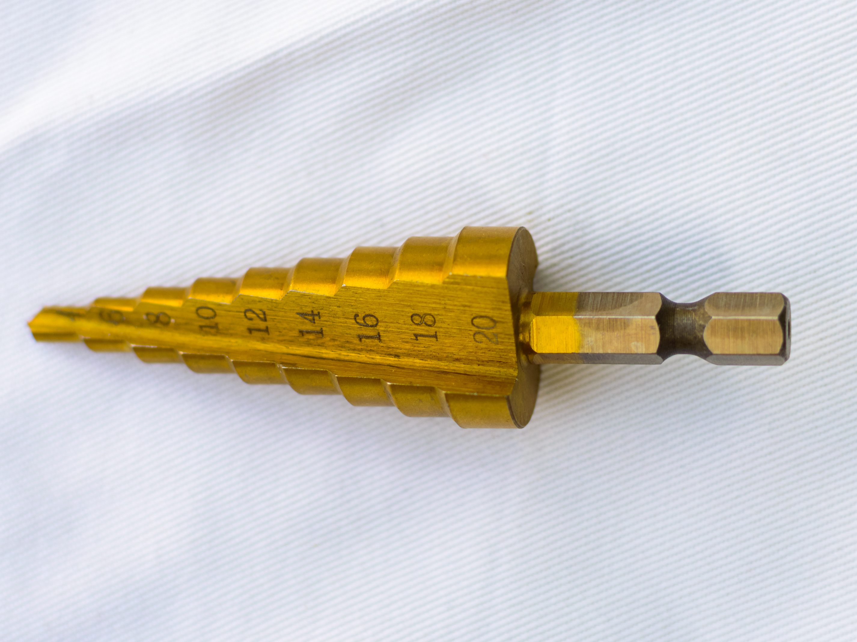 На изображении представлена золотая ступенчатая сверловая бита, лежащая на белой текстурированной поверхности, напоминающей ткань. Инструмент имеет конусообразную форму с последовательно увеличивающимися ступенями, каждая из которых отмечена числовым значением, указывающим на диаметр сверления. Маркировка начинается с меньших чисел у острого конца и увеличивается до 20 у основания.