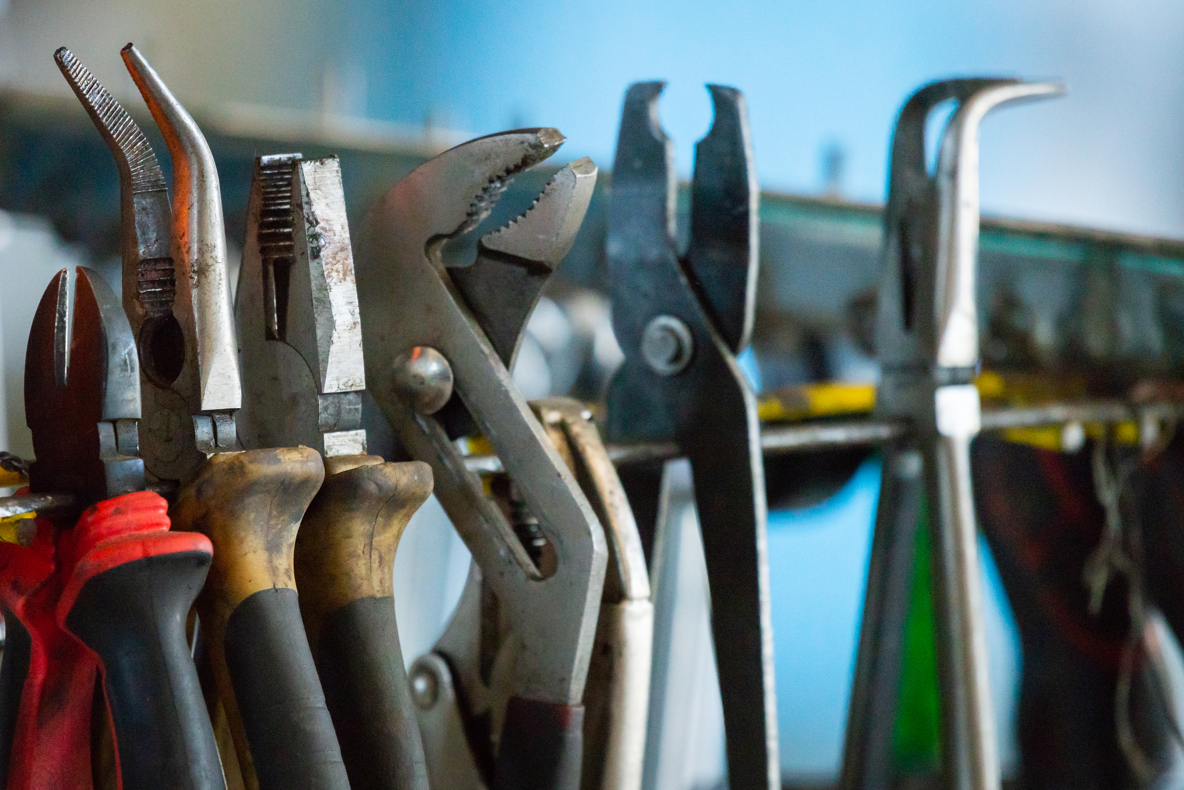 The frame captures an old workbench in a car workshop, bathed in soft, diffused light, likely from a window outside the shot. The overall scene creates a sense of calm and focus characteristic of craft workshops. In the background, there's a slightly blurred order of tools and parts, hinting at a long history of this place as the heart of automotive repair. Time seems to have stood still here – it’s not a bustling modern workshop, but rather a corner where traditions of craftsmanship blend with functionality. The atmosphere is permeated by the smell of machine oil and metal, creating a sense of authenticity and coziness. The focus is on pliers lying on the wooden workbench surface. This simple tool, a symbol of skill and precision, is the key element of the composition, attracting the viewer's gaze. It’s clear that this isn’t a new, shiny tool; it’s a working one, scratched by time and experience, but reliable and ready to perform its task.