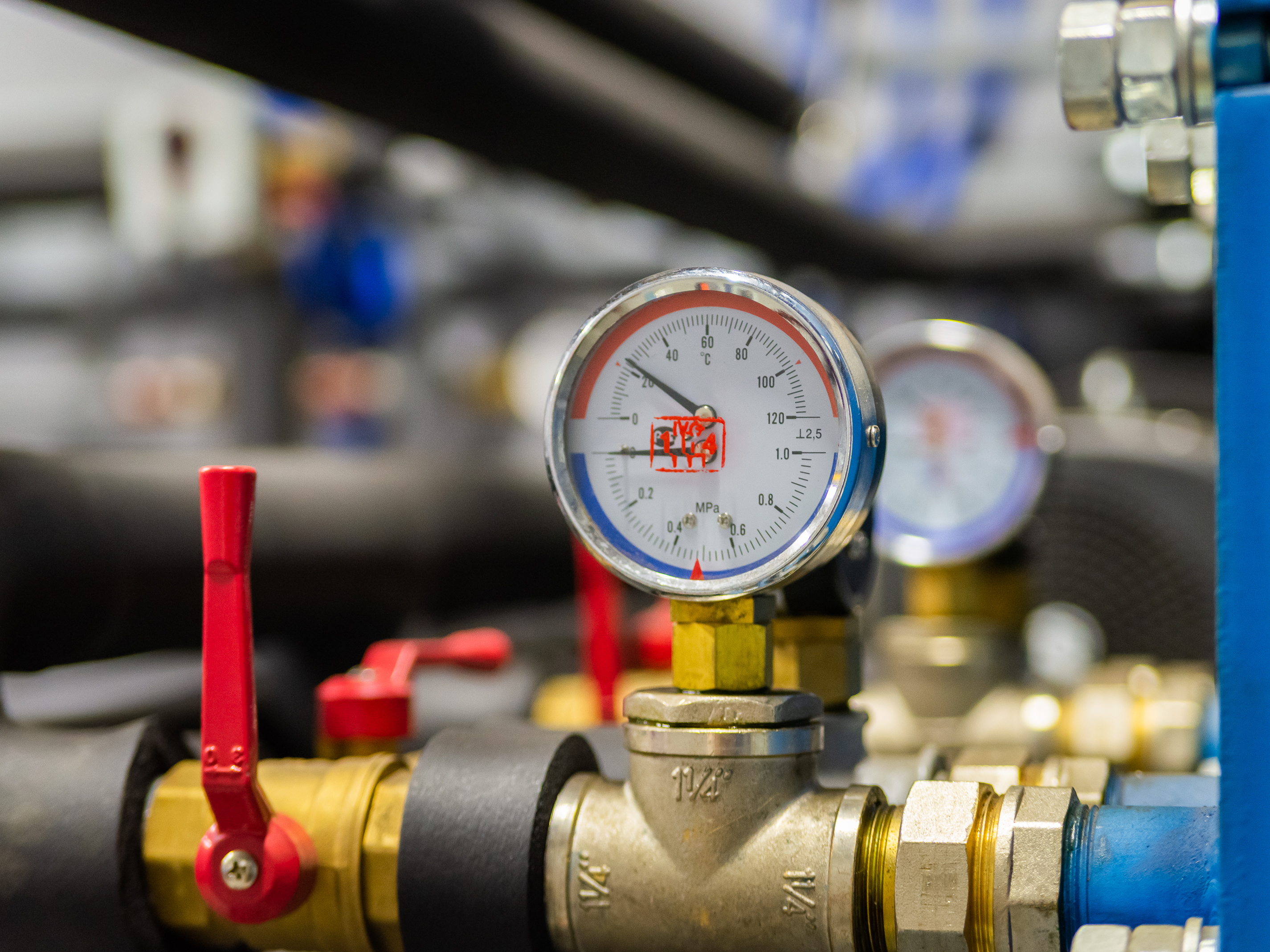 Снимок вызывает ощущение стабильности и надежности, присущих промышленному оборудованию. Красный цвет вентилей добавляет нотку тревоги и предупреждения – напоминание о необходимости соблюдения правил безопасности при работе с системой отопления. Композиция создает впечатление технического совершенства и функциональной красоты. Фотография идеально подойдет для иллюстрации статей об энергетике, промышленности или системах отопления, а также для использования в качестве фона на рабочих столах тех, кто ценит точность и надежность инженерных решений.