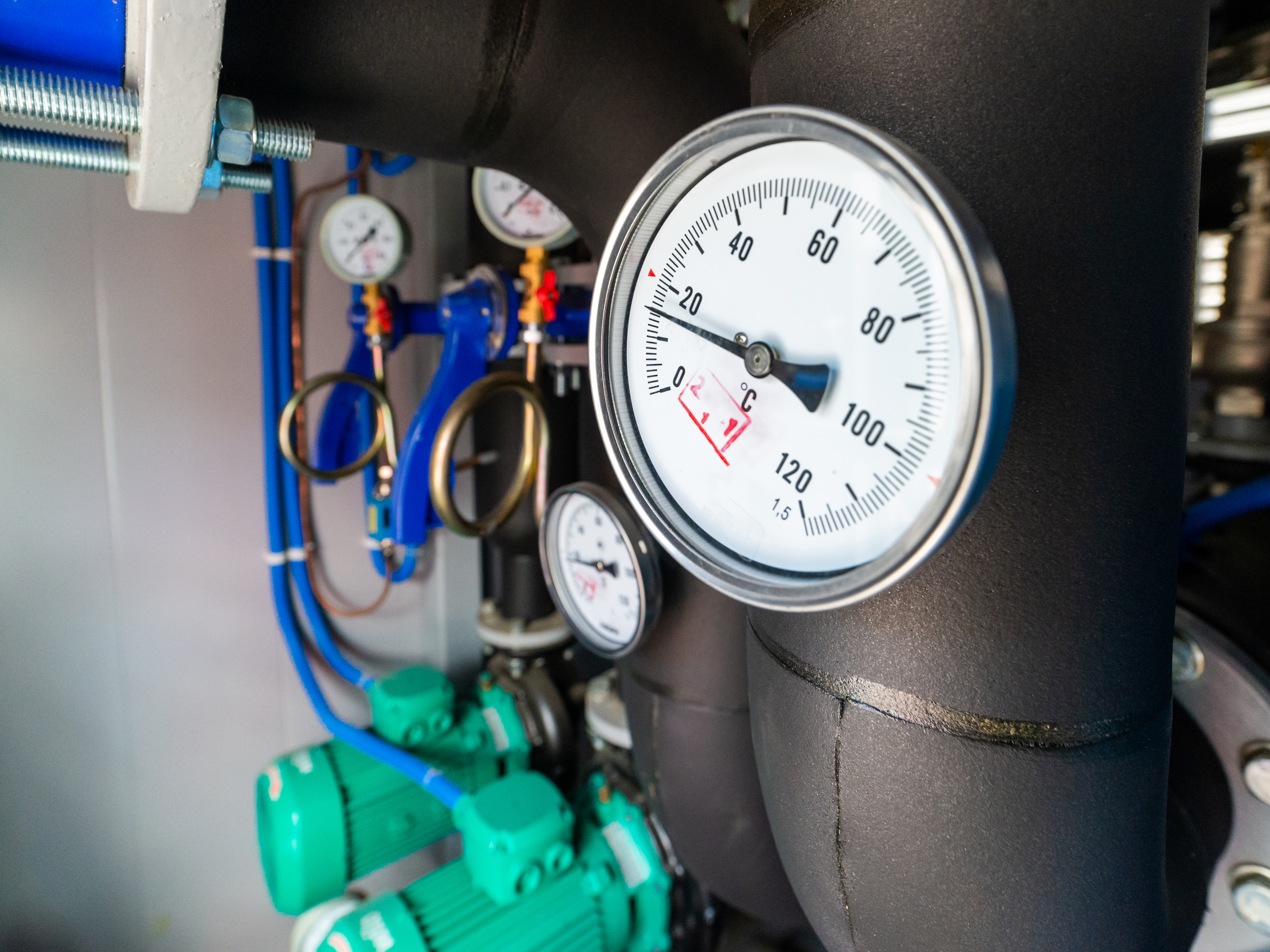 Around the thermometer, massive black pipes are visible, covered with insulating material, signifying their role in heat transfer. The pipes are connected using flange joints, showcasing the robustness and reliability of the construction. Nearby, other smaller gauges and thermometers display various system parameters.