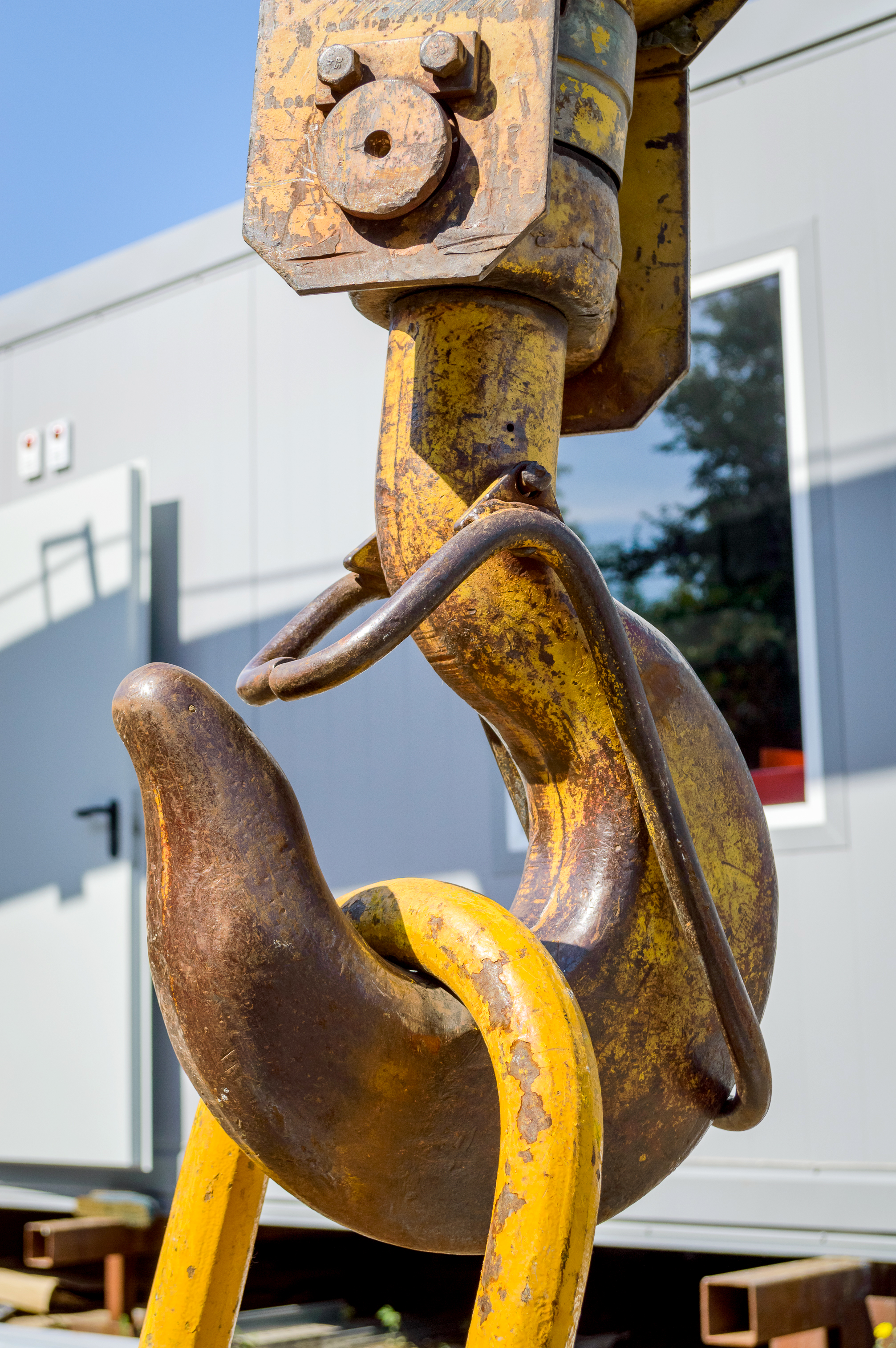 This image captures the power and reliability of industrial equipment, focusing on a close-up view of a massive construction crane hook. The hook, painted in a vibrant yet chipped yellow, displays signs of intensive use, such as scuffs and rust marks, highlighting its durability and readiness for heavy-duty tasks.