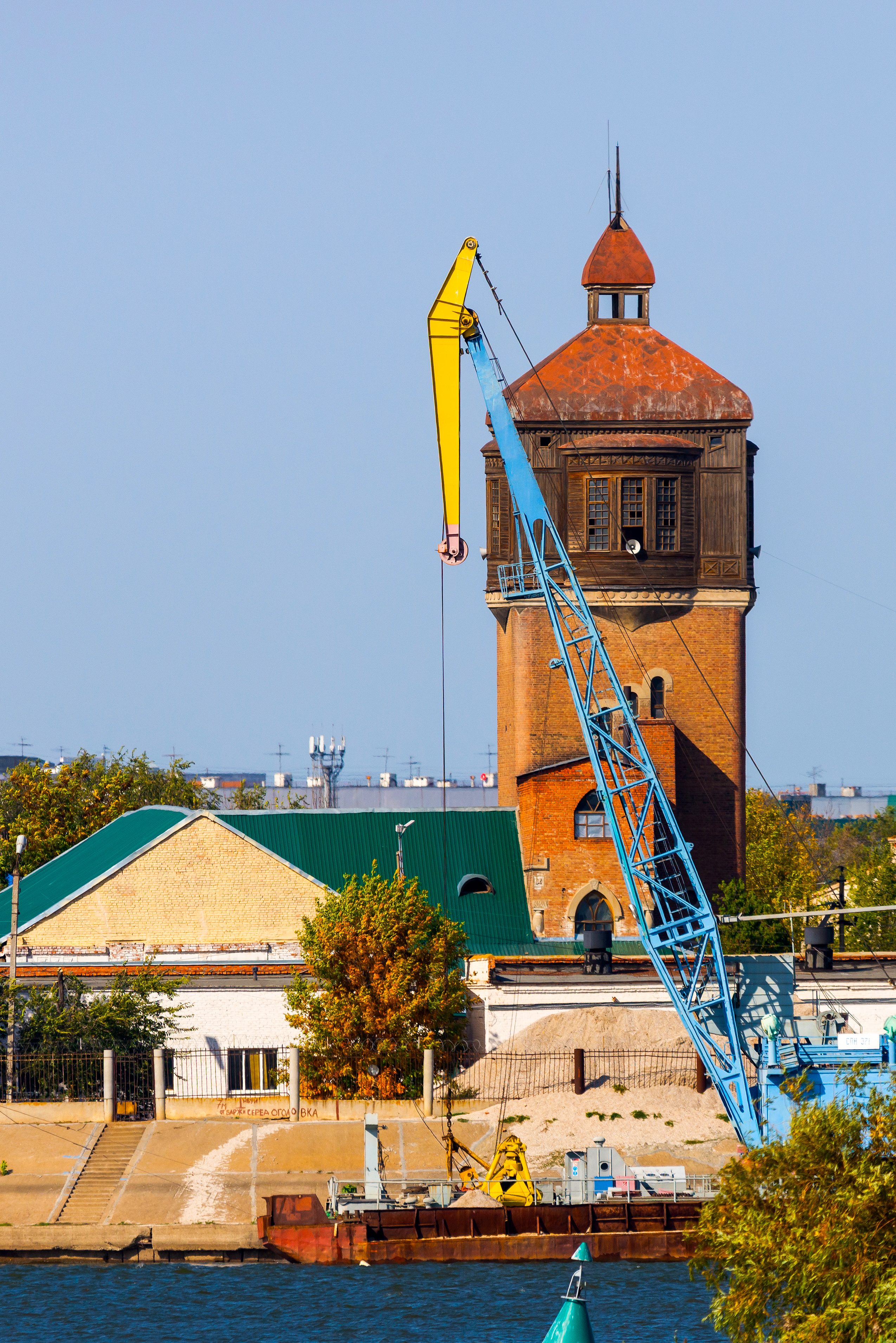 Композиция мастерски сочетает промышленные элементы с архитектурным наследием. Высокая стальная конструкция крана диагонально разрезает кадр, привлекая внимание и создавая резкий контраст с вертикальными линиями водонапорной башни. Вода внизу отражает небо и сооружения, добавляя глубину и масштаб. Детали показывают потертые текстуры на металлических поверхностях крана, старый кирпичный фасад башни и зеленые крыши соседних зданий. Освещение яркое и прямое, отбрасывающее резкие тени, которые подчеркивают объемные формы и материалы. Каждый элемент — от далекого городского ландшафта до переднего плана прибрежной зоны — тщательно расположен для создания гармоничного, но динамичного промышленного полотна.