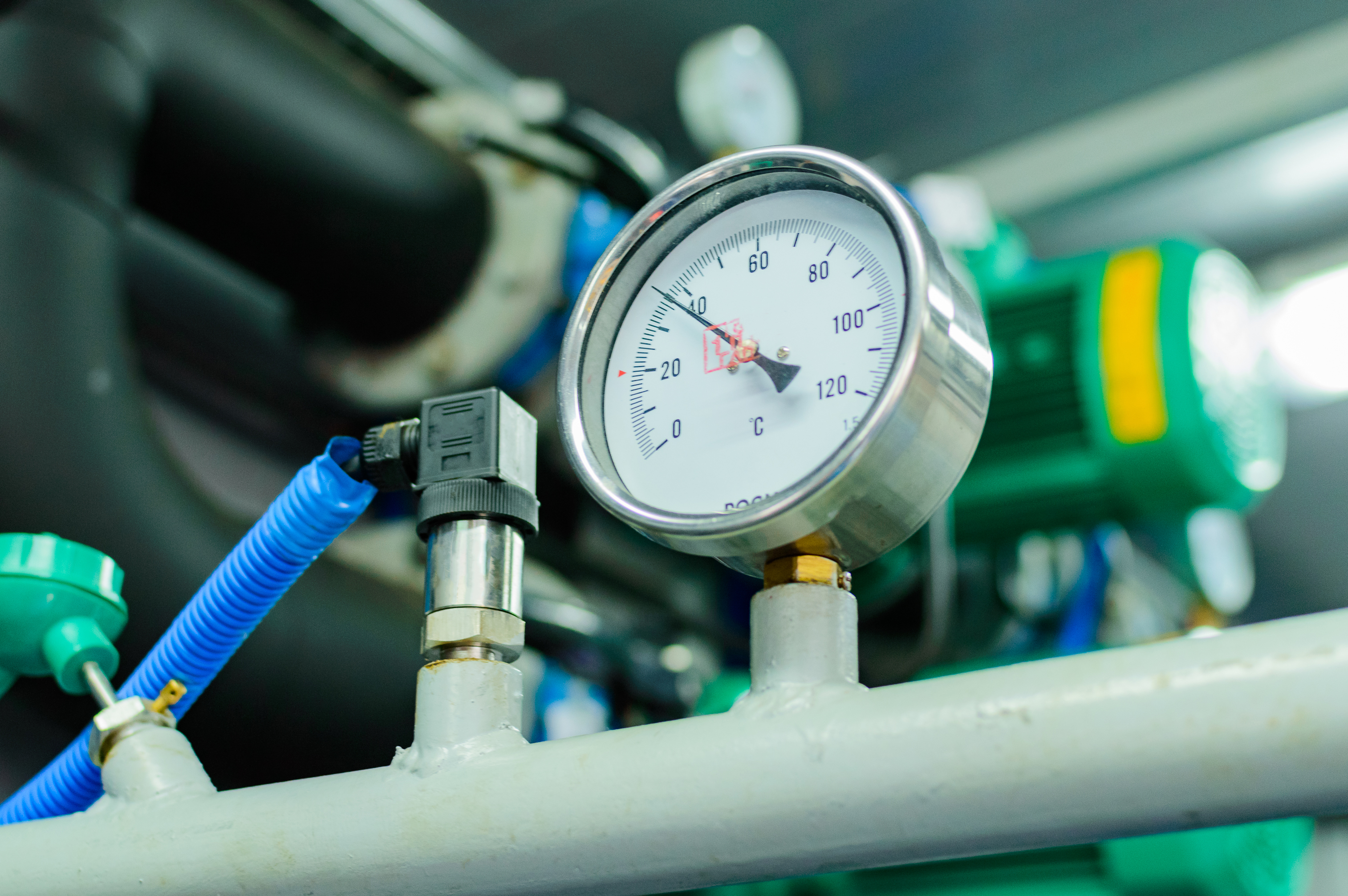 На заднем плане просматриваются другие элементы промышленного оборудования: темные трубы большого диаметра, зеленый насос или другой механизм с желтыми акцентами, а также другие датчики и трубы, создающие ощущение рабочего процесса в техническом помещении. Цветовая палитра изображения состоит из приглушенных тонов: серого, белого, черного, с яркими акцентами синего и зеленого, что характерно для промышленных интерьеров.