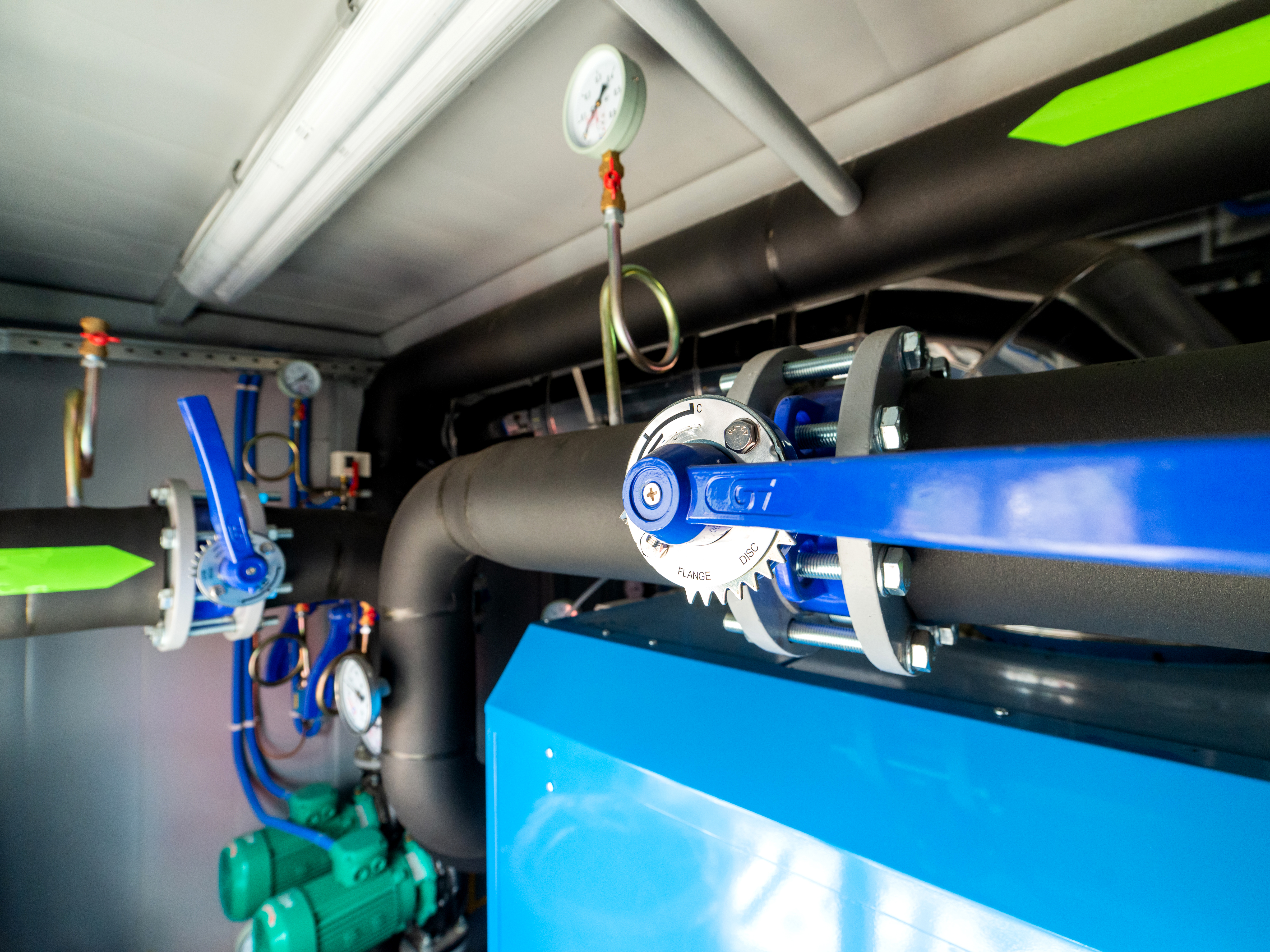 A green arrow applied to one of the pipes serves as a visual indicator of the flow direction, adding informativeness and clarity to the image. The lighting in the room is likely artificial, using long fluorescent lamps, creating an even but somewhat sterile light typical of technical facilities. The pipes are covered with black insulation, indicating the need to maintain a certain temperature of the medium being transported.
