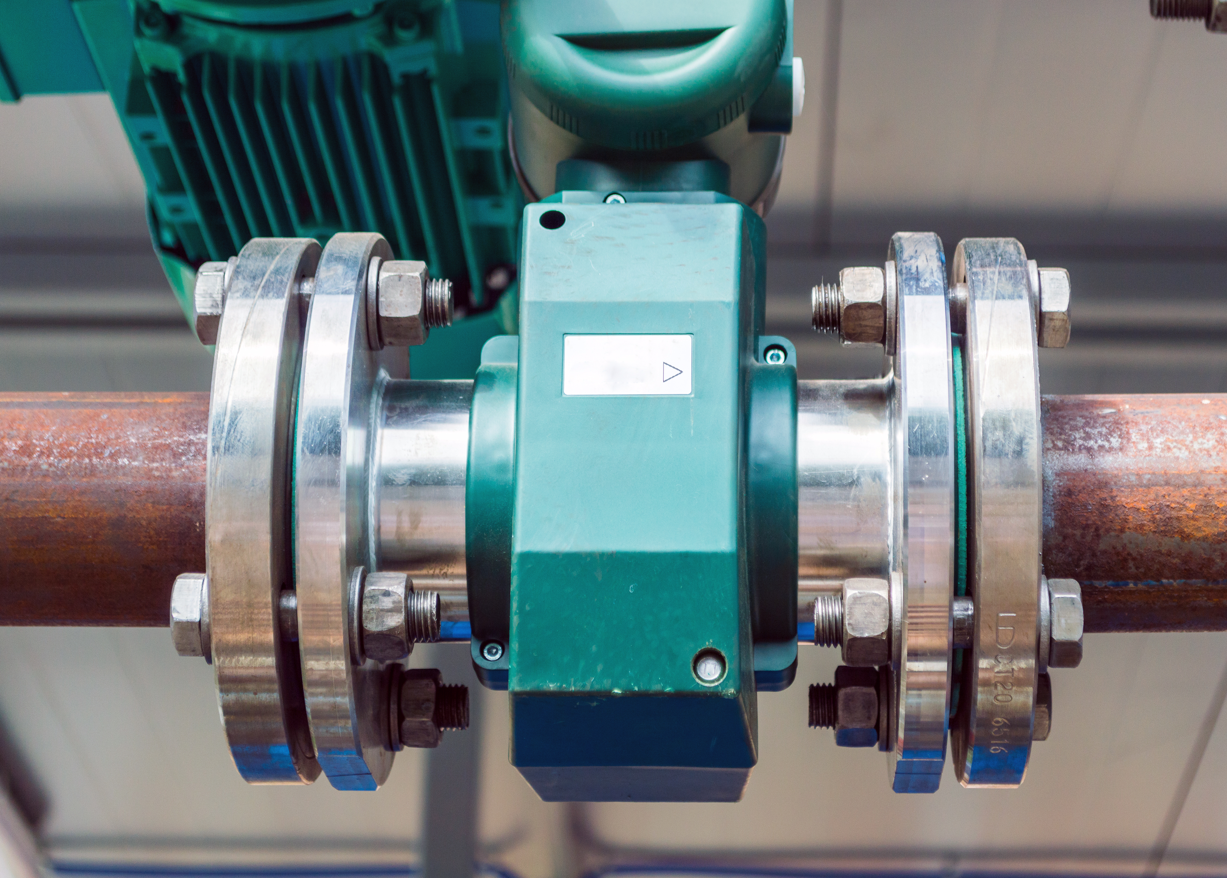 На заднем плане просматривается часть электродвигателя или другого промышленного оборудования, также выполненного в зеленом цвете, что создает единую цветовую гамму и указывает на принадлежность к одному производственному комплексу. Освещение равномерное, без резких теней, что позволяет рассмотреть все детали и текстуры материалов – от шероховатости медной трубы до гладкости металла фланцев и пластика корпуса прибора.