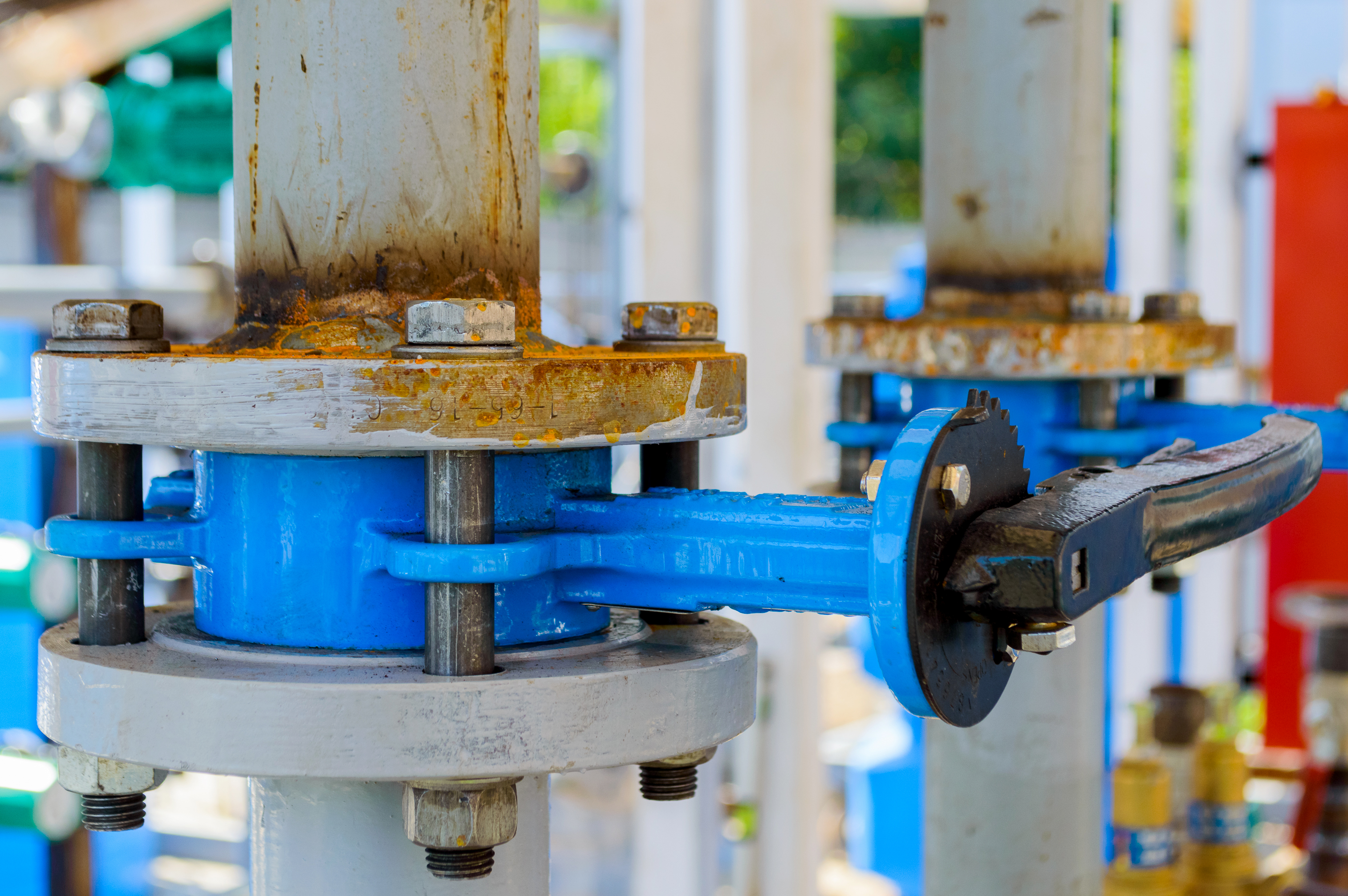 Крупные болты, соединяющие фланцы, также показывают следы времени, но их прочное крепление подчеркивает надежность конструкции. Цветовая палитра изображения варьируется от холодных оттенков металла и синего до теплых, землистых тонов ржавчины. На заднем плане размытые зеленые и красные элементы оборудования намекают на обширность и сложность индустриального комплекса, создавая ощущение глубины и масштаба.