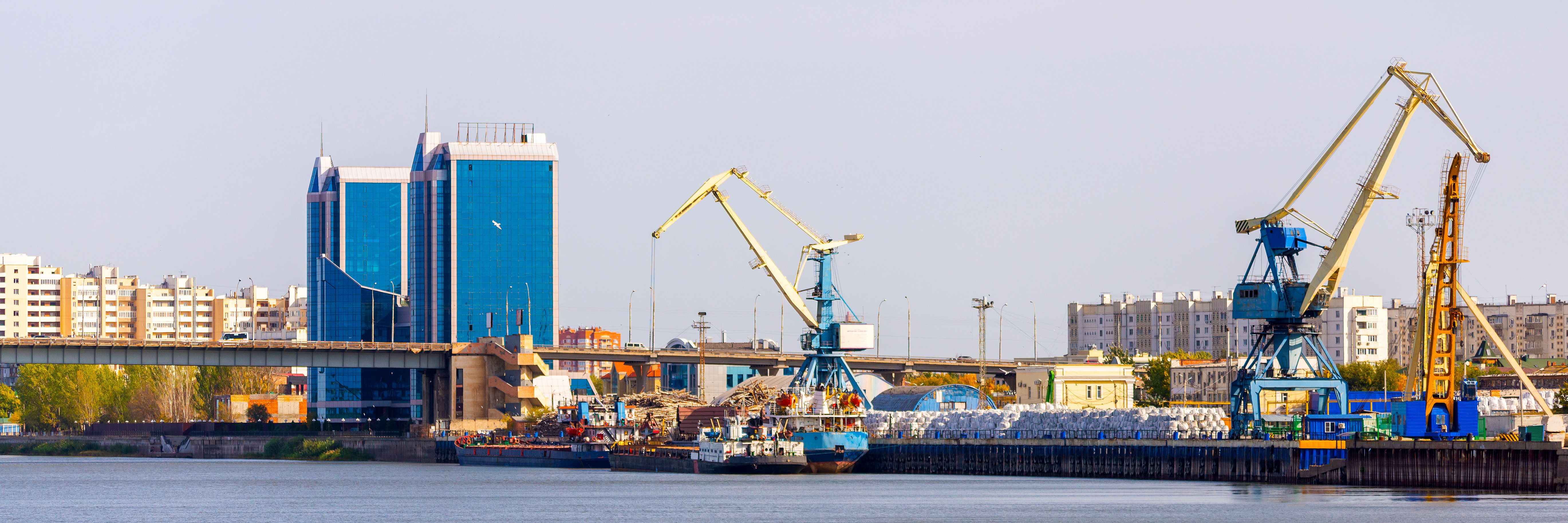 The image features intricate details: the metallic texture of crane arms contrasts sharply with the smooth reflective surfaces of modern glass buildings. Vessels laden with cargo are moored alongside wooden or concrete piers, their hulls painted in faded blues and whites. The sky above is a pale blue canvas, unmarred by clouds, enhancing the clarity of every object from afar to near. Textures range from gritty asphalt roads to polished steel beams and glass panels. Colors dominate with industrial tones—blue, yellow, gray—and punctuated by green foliage along riverbanks. Lighting is natural daylight, evenly distributed across all surfaces, which highlights geometric shapes and mechanical lines without harsh contrasts. The perspective is wide-angle, capturing vast expanses of water, sky, and infrastructure from a slightly elevated viewpoint that places the viewer at ground level yet offers an expansive horizon view.