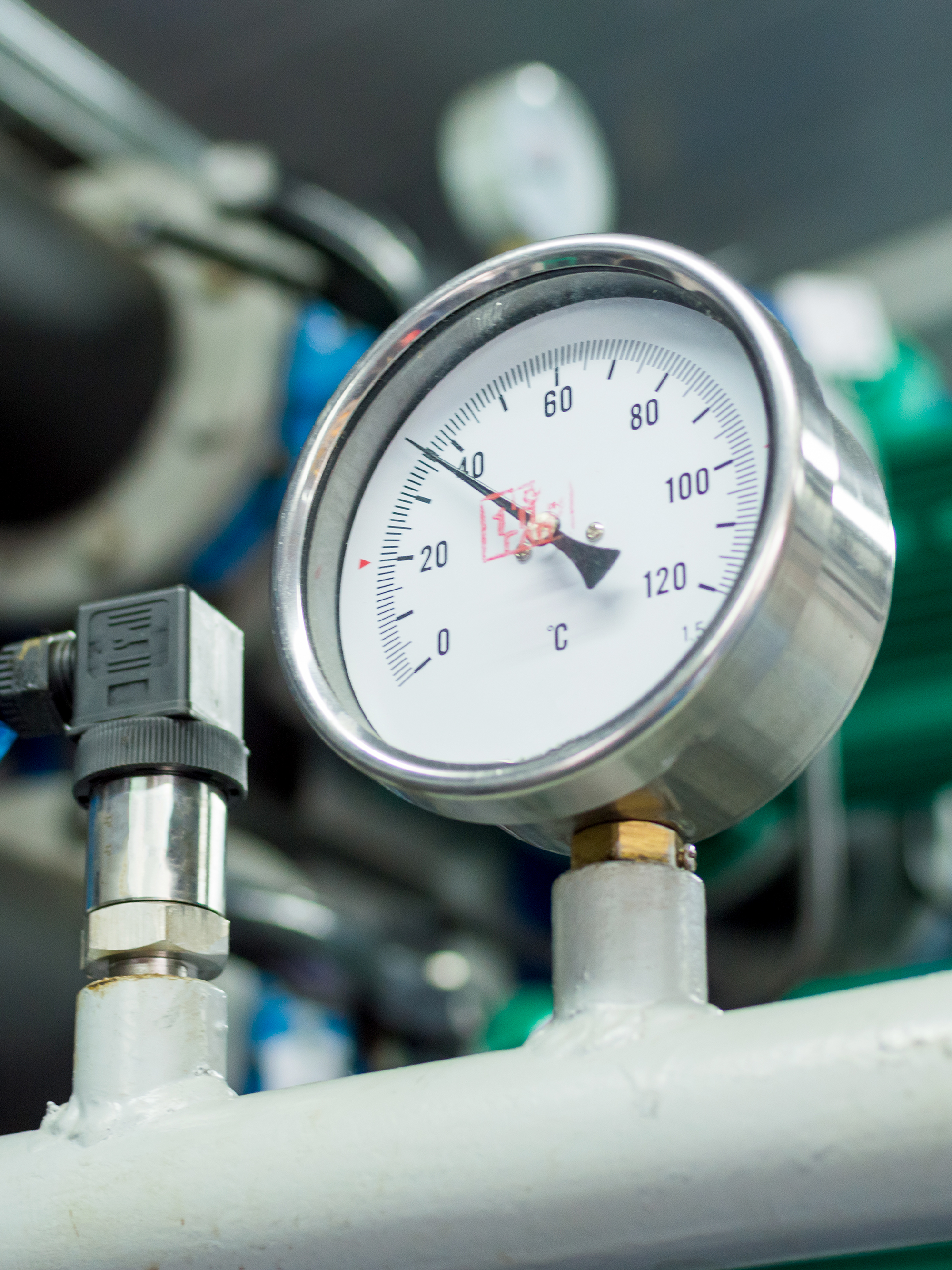 Данное изображение представляет собой детальный крупный план промышленного манометра, установленного в сложной системе трубопроводов. Прибор, выполненный из нержавеющей стали, имеет четкую белую шкалу с цифровыми отметками от 0 до 120 градусов Цельсия. Стрелка манометра указывает на значение около 20 градусов, что говорит о текущей температуре в системе.