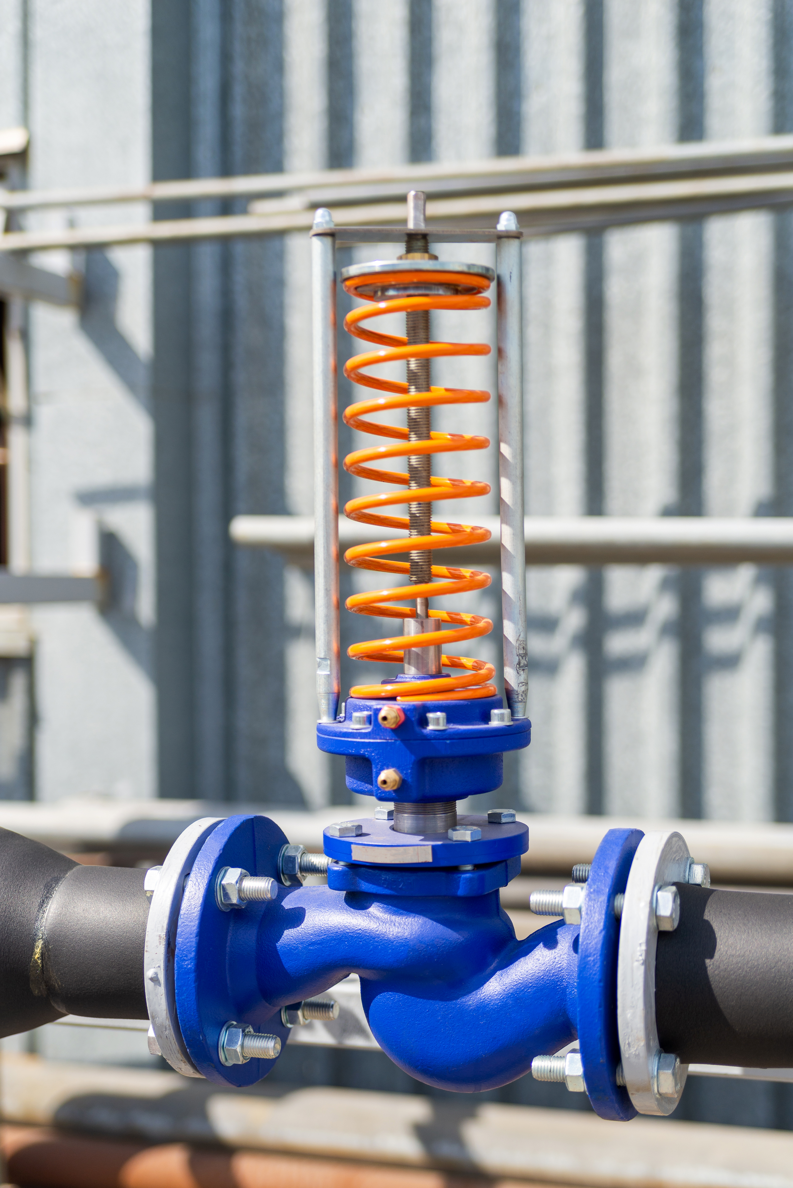 На фотографии представлен захватывающий крупный план промышленного клапана, демонстрирующего сложность и функциональность современной инженерной инфраструктуры. Центр внимания – сам клапан, выполненный в насыщенном синем цвете, который контрастирует с ярким оранжевым акцентом внутри корпуса. Камера запечатлела этот объект на фоне массивных стальных труб, подразумевающих масштабность промышленного процесса, происходящего где-то за кадром. Освещение равномерное, подчеркивающее детали и текстуры оборудования. В целом, изображение создает впечатление точности, надежности и индустриальной мощи, характерной для современных промышленных предприятий. Видно, что фотография сделана в реальном промышленном окружении, возможно, на производственном объекте или электростанции, где подобное оборудование играет ключевую роль в обеспечении бесперебойной работы.