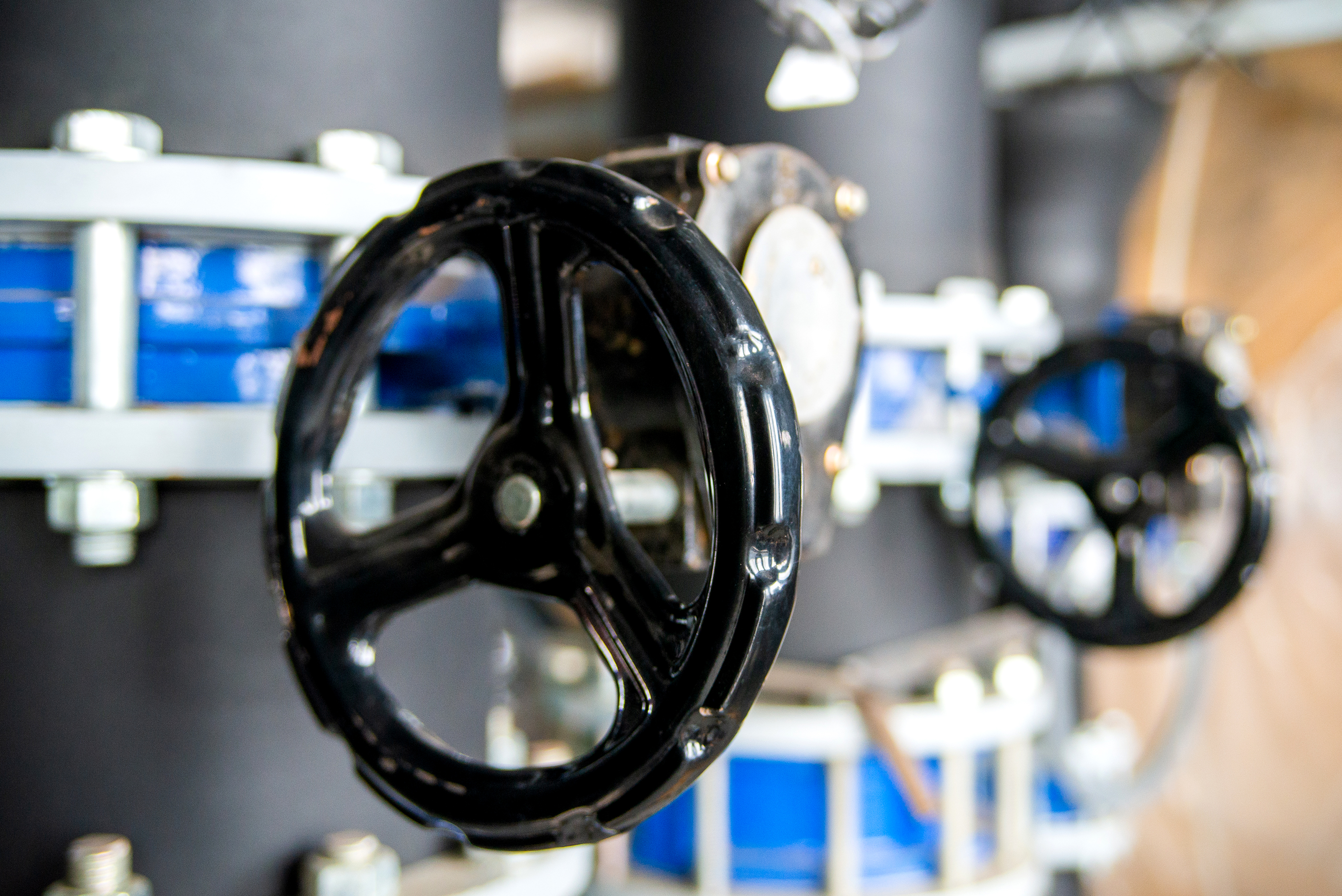 The photograph presents a captivating close-up of an industrial valve, dominating the frame with its power and functionality. This isn’t just a piece of equipment—it's a symbol of flow control, an integral part of modern industry's complex infrastructure. The valve is executed in deep black, highlighting its reliability and durability, as well as creating a contrast effect against the surrounding space. The camera has captured a moment of stillness, when the valve performs its crucial task, ensuring the smooth operation of the technological process. The composition is carefully considered – the subject is positioned in the center of the frame, emphasizing the viewer's attention on its details and form. The background features a complex system of blue pipes of various diameters, interwoven with metal connections, creating a sense of scale and complexity of the technological process occurring behind the scenes.