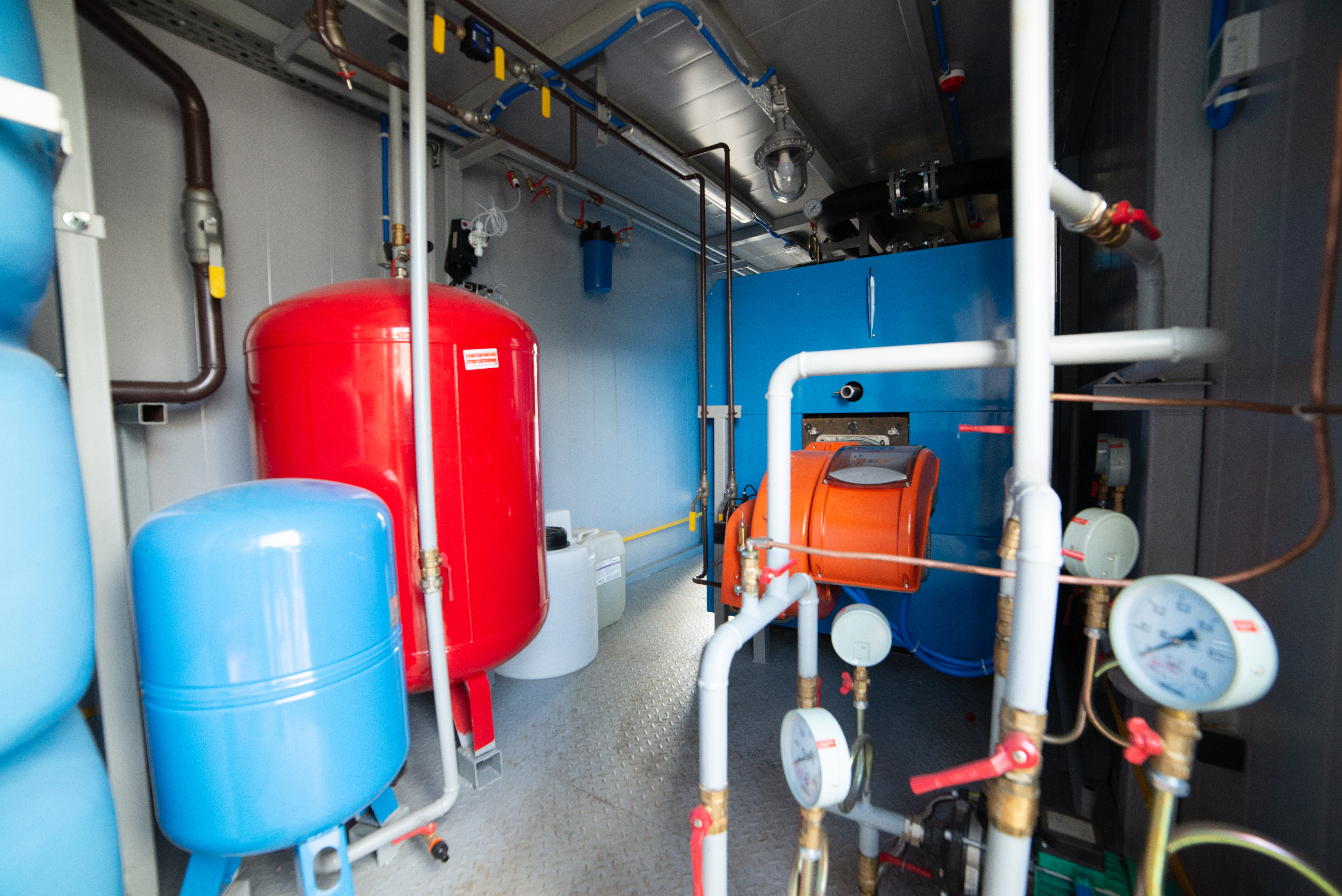A red expansion tank, positioned vertically, contrasts with the blue reservoirs, creating visual interest and highlighting functional zoning. Gauges indicating working pressure are visible on the pipes, along with valves that allow for flow regulation.