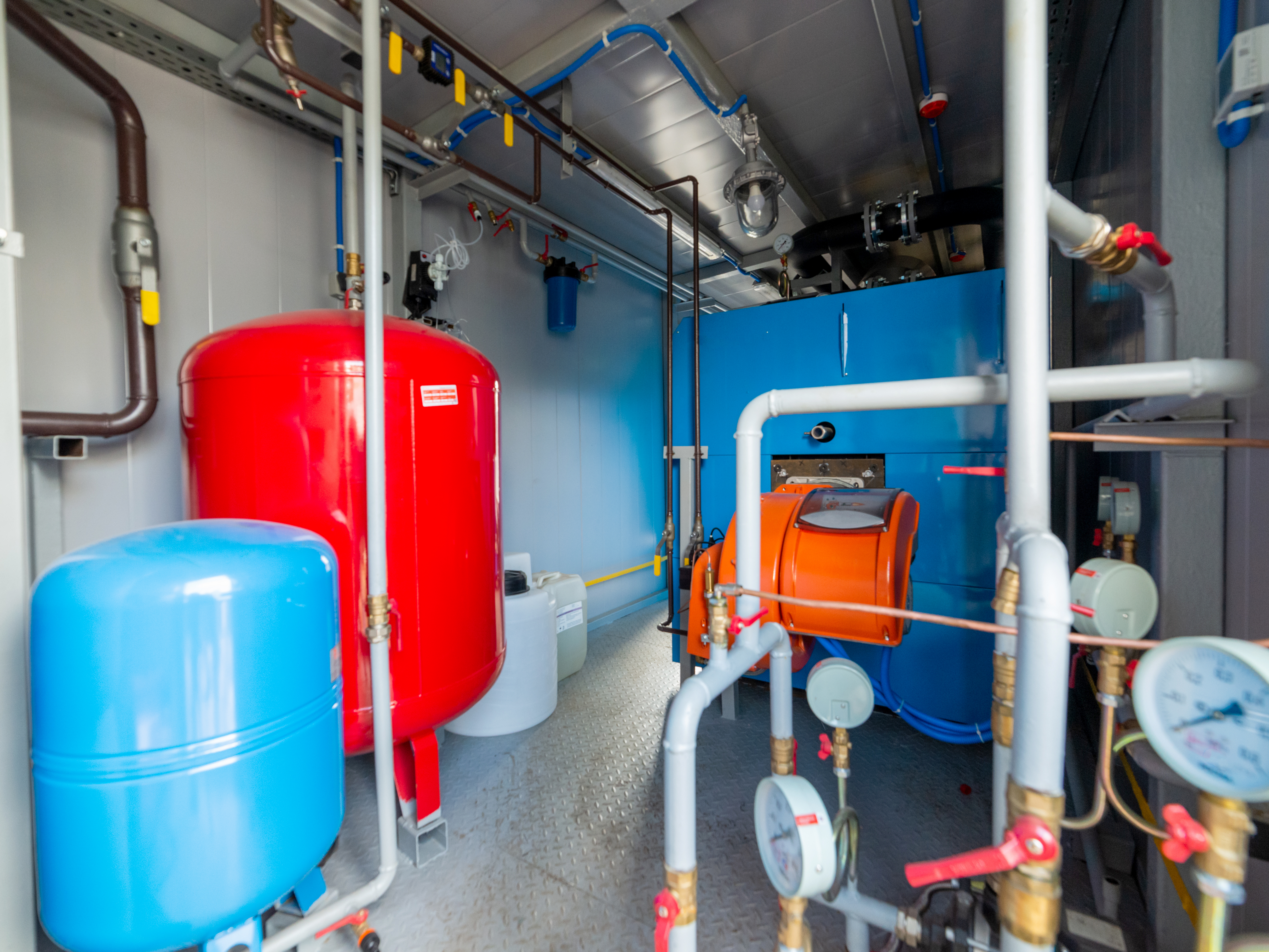 Данное изображение представляет собой детальный снимок внутренней части современной котельной, демонстрирующий комплексное инженерное оборудование, отвечающее за отопление и водоснабжение.