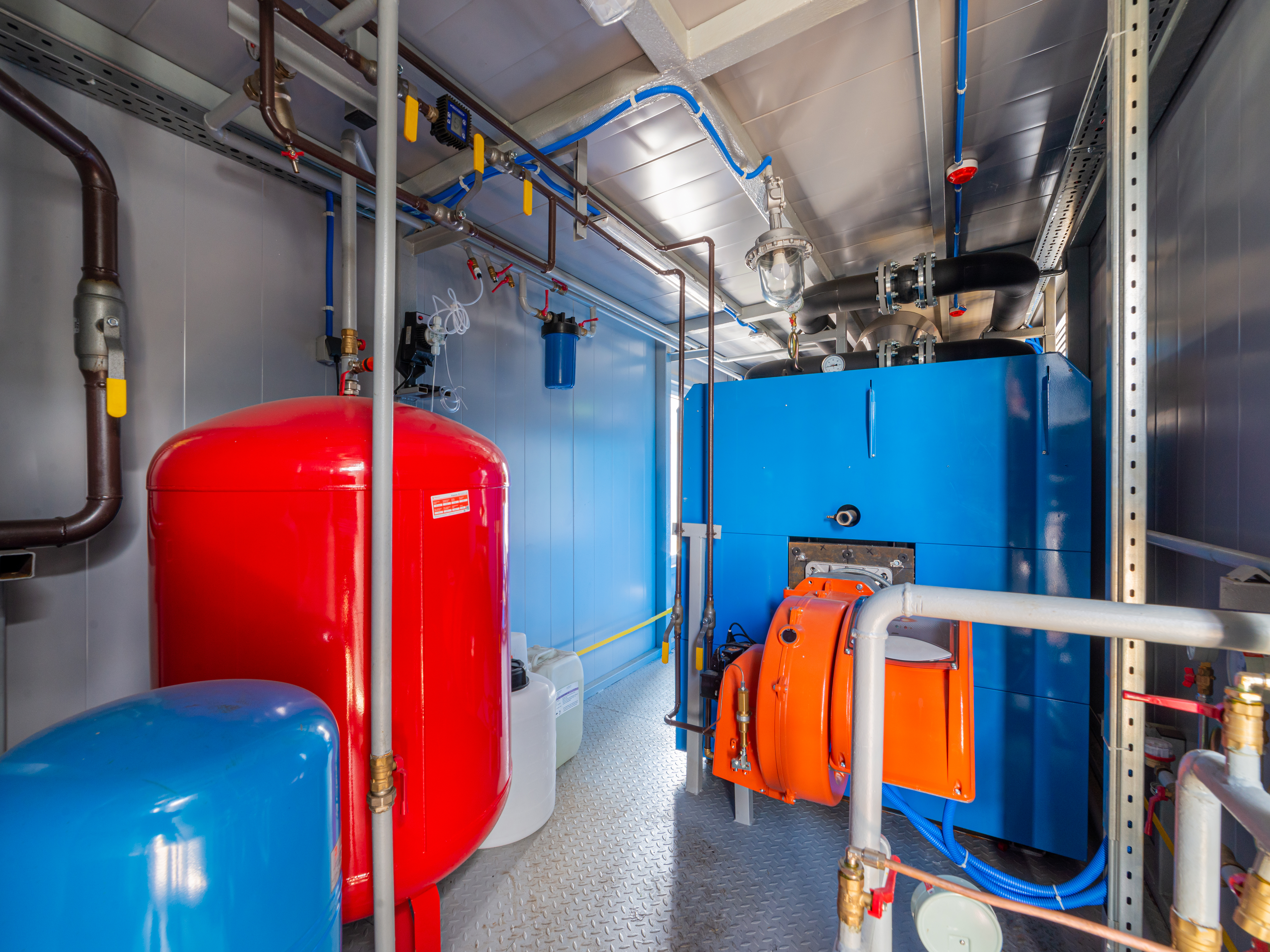To the left of the boiler is a large red expansion tank, an integral part of the heating system, regulating hydraulic pressure. Next to it, a smaller blue tank is visible, likely serving similar functions or being part of a water treatment system. Both tanks have a smooth, glossy surface that reflects light, creating a sense of cleanliness and meticulous maintenance.
