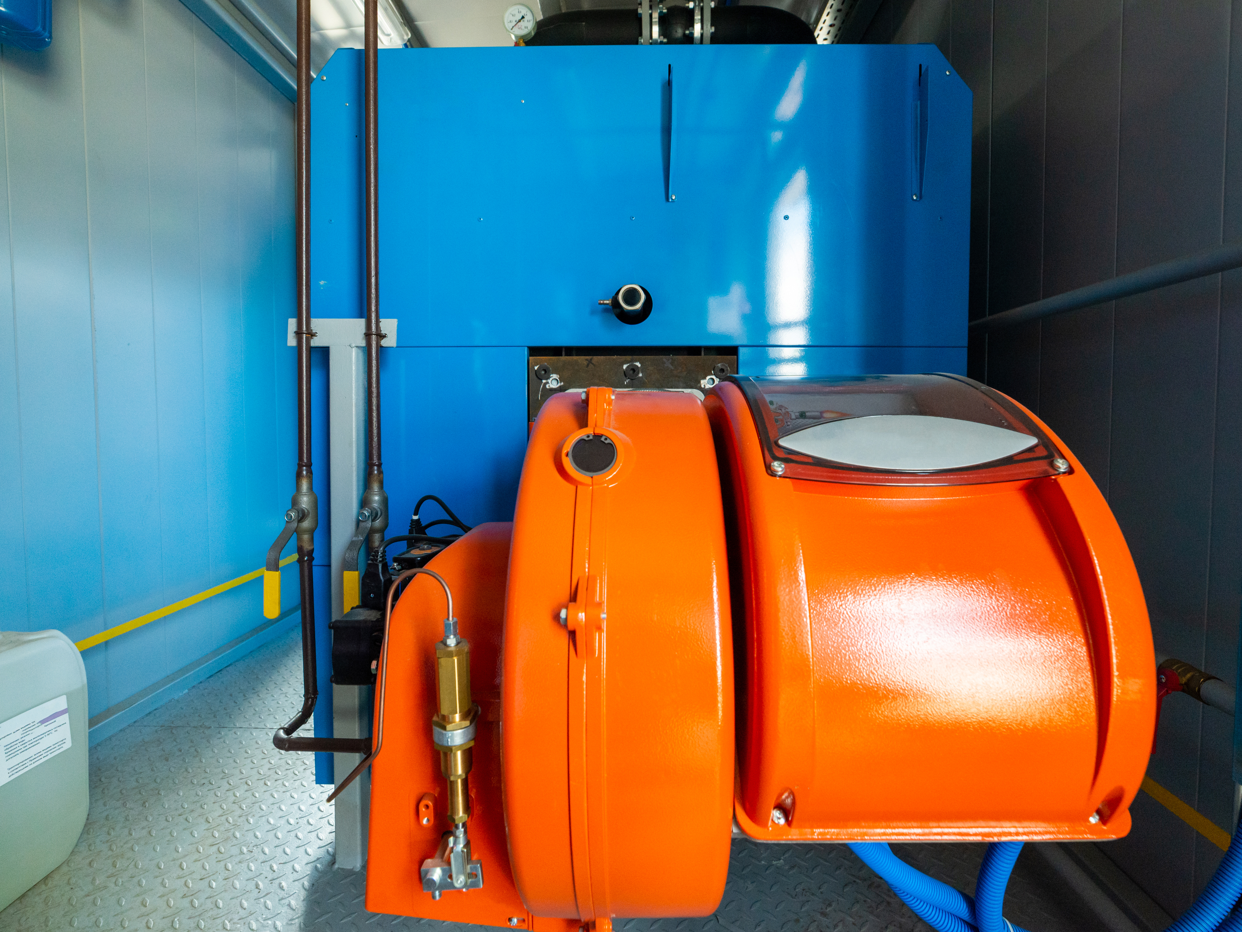 За оранжевой частью виднеется крупный синий корпус котла, также имеющий гладкую, отражающую поверхность. На синем фоне расположены различные технические элементы: трубки, вентили, манометр, расположенный в верхней части, и небольшое темное отверстие. Сочетание ярко-синего и насыщенного оранжевого цветов создает динамичный и запоминающийся образ, выделяя оборудование на фоне более нейтрального окружения.