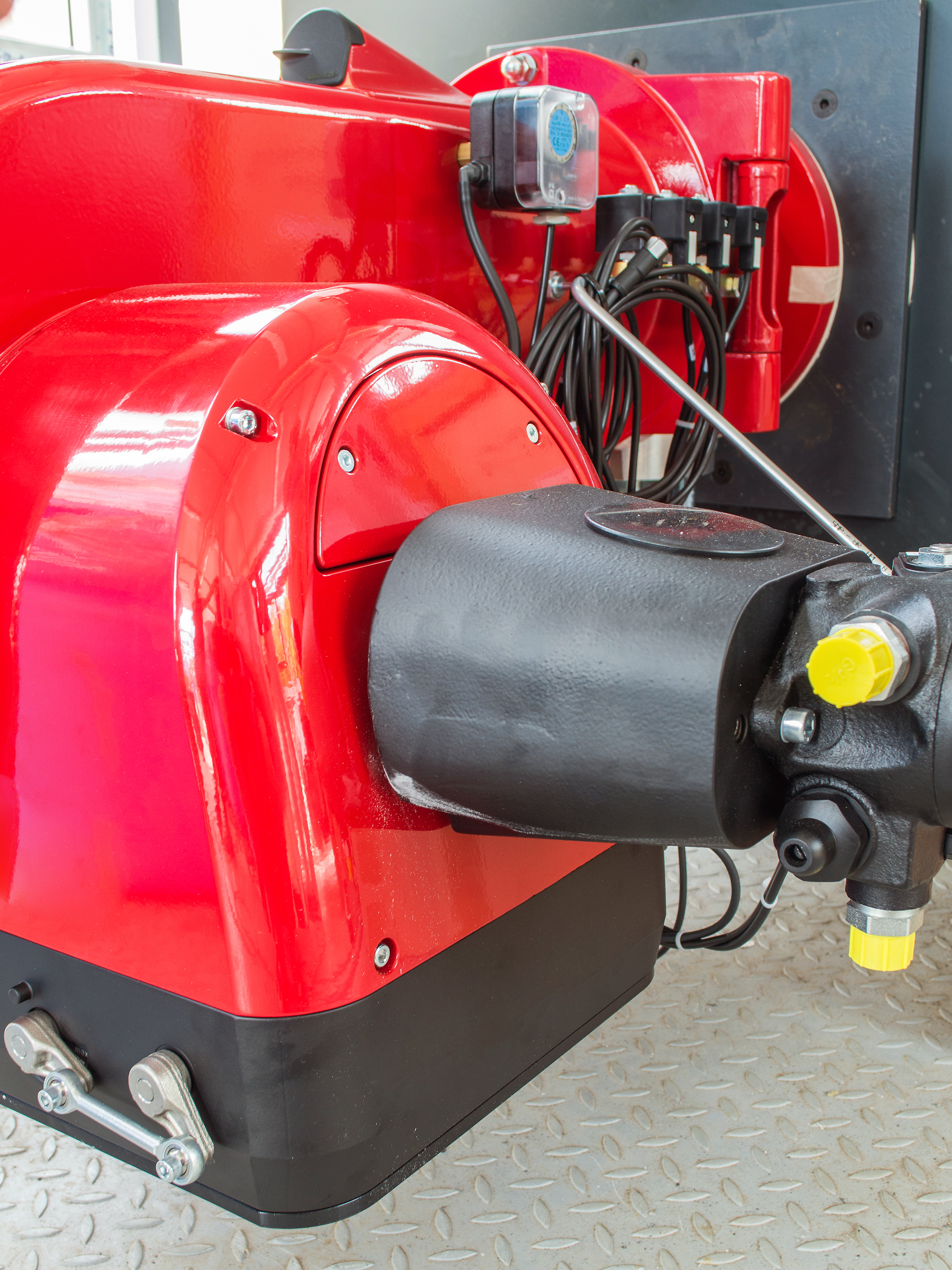 The bright colors, especially the red casing, create a dynamic impression, contrasting with the dark elements and the metal surface. The photograph is ideal for illustrating topics related to industrial equipment, heating systems, energy, manufacturing processes, or engineering solutions. The level of detail allows for examination of the quality of assembly and materials, which is important for professional users and specialists.