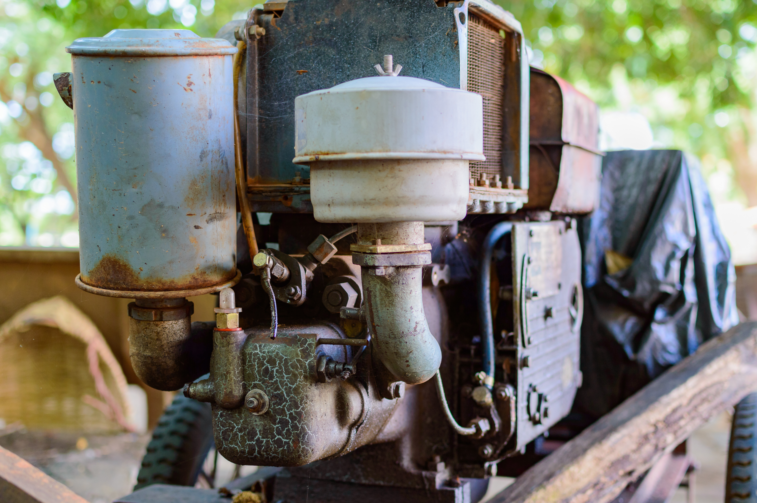 This close-up shot showcases the details of an old, worn-out engine, seemingly situated in a rural environment. Bright daylight illuminates the texture of rust and dirt covering the metal surfaces, imbuing the image with a sense of time and history.
