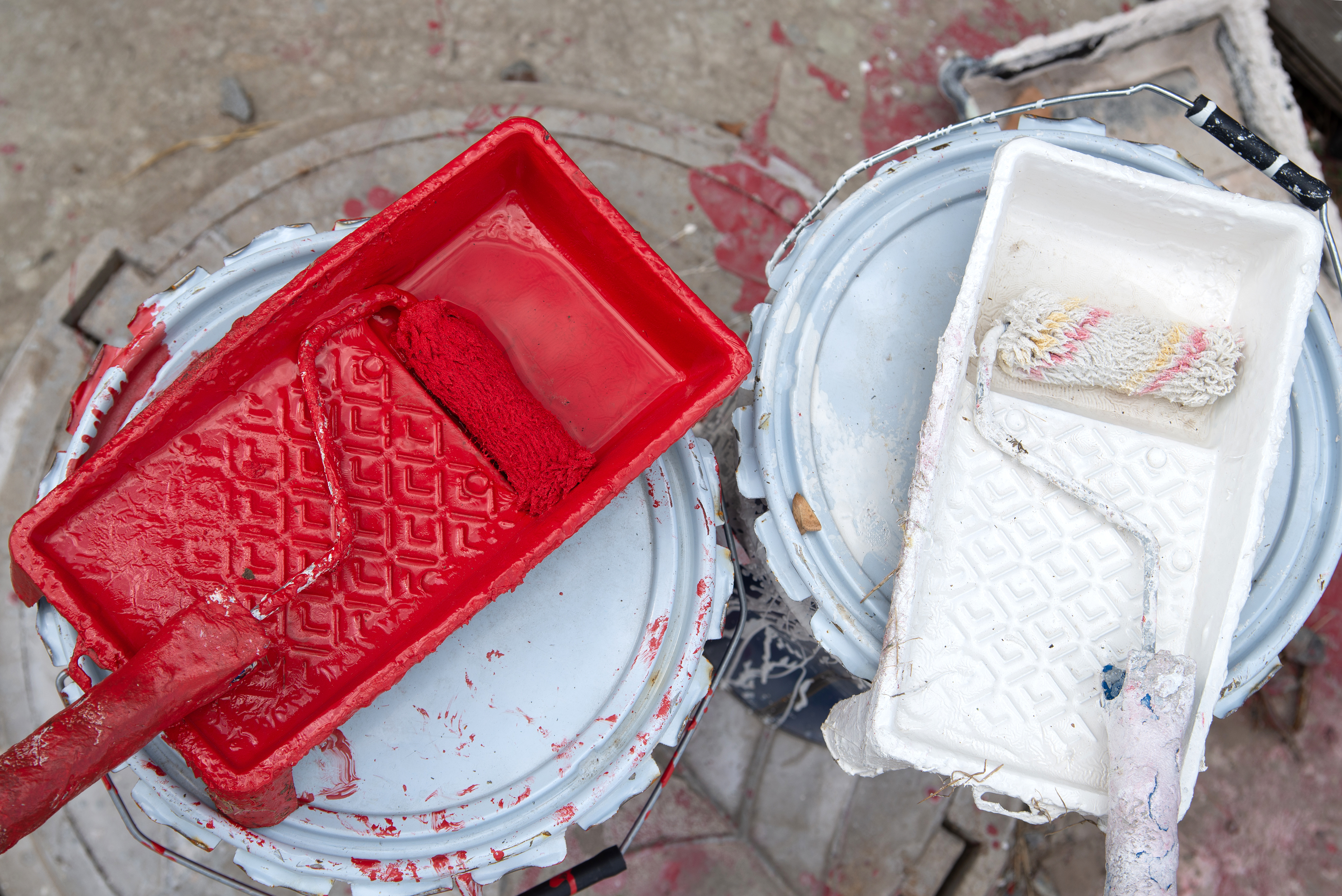 Adjacent to the trays are two large metal cans, presumably containing paint. One can, on which the red tray rests, has a light silver hue with reddish paint splatters, indicating recent use. The second can, with the white tray, is also light-colored, and its surface is adorned with paint marks and possibly dust or construction material particles.