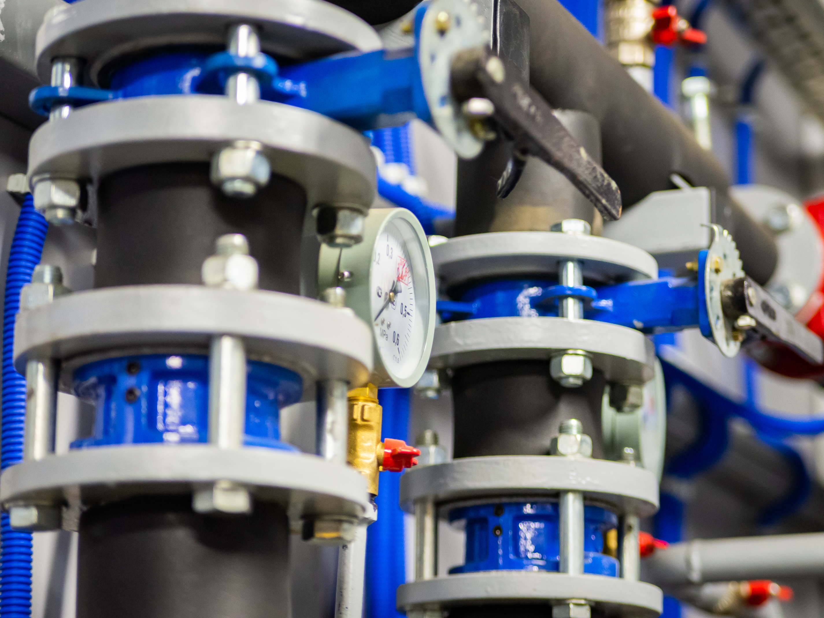 The composition of the shot is structured to maximize the complexity and multifaceted nature of the pipe and valve system. The main focus is on the pressure gauge, its needle pointing to a specific pressure, which adds dynamism to the static scene. The variety of materials – from rough metal to the smooth glass of the gauge – creates an interesting visual contrast. The lighting is even, but with small accents on individual elements, highlighting their shape and texture. Pipes of various diameters and shapes intertwine with each other, forming a complex pattern that captivates with its detail. Some areas are covered in rust or soot, indicating long and intensive equipment operation, adding realism and authenticity to the image. Reflections of light on metallic surfaces give the scene volume and depth.
