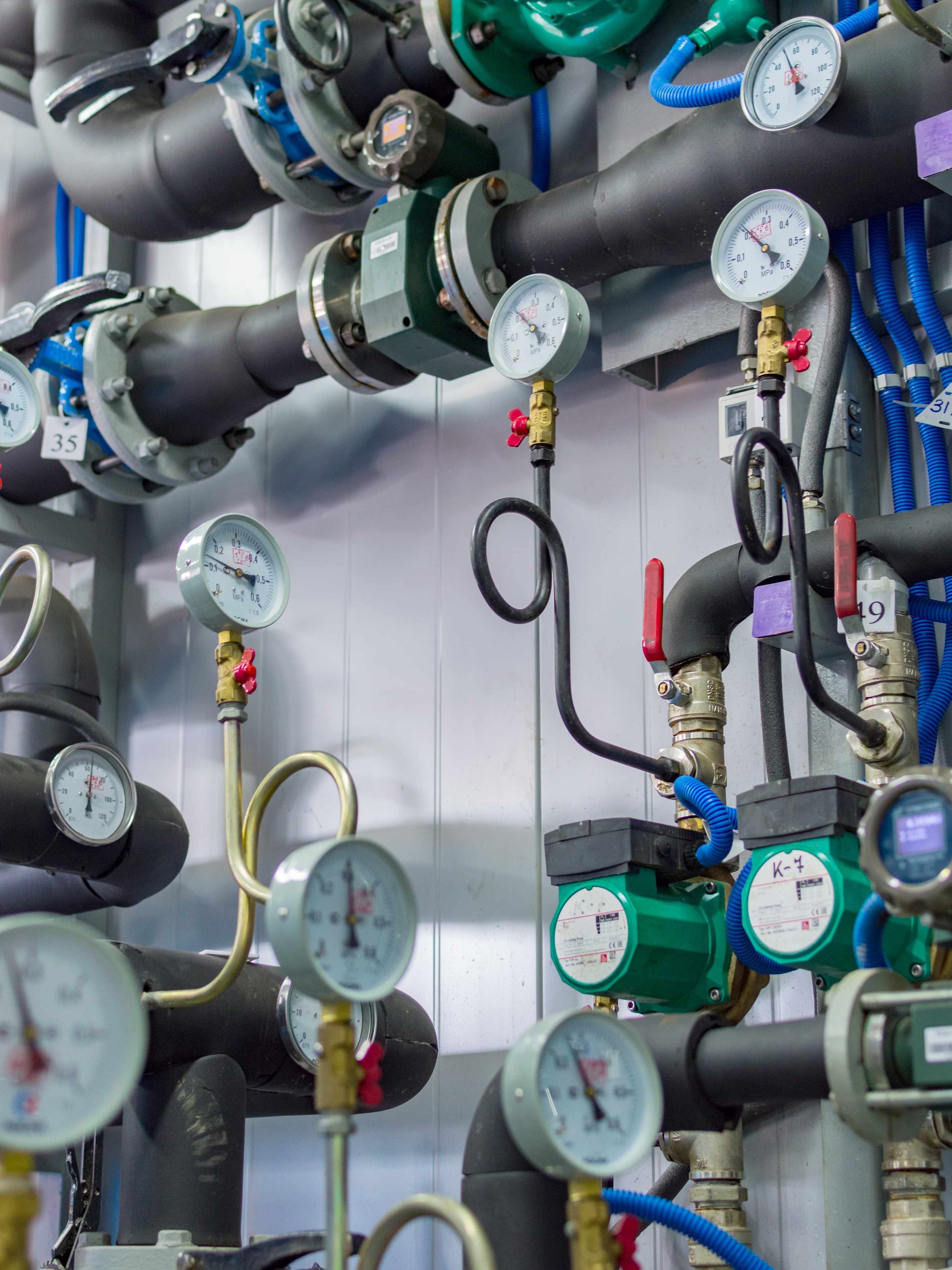 Освещение равномерное, что позволяет рассмотреть все детали и текстуры. Фотография передает ощущение функциональности, точности и надежности инженерной системы. Она идеально подходит для иллюстрации тем, связанных с отоплением, водоснабжением, промышленной автоматикой, энергетикой и обслуживанием зданий. Композиция построена таким образом, что взгляд зрителя скользит по множеству деталей, подчеркивая сложность и организованность конструкции. Фокус камеры намеренно смещен, чтобы выделить ключевые элементы, такие как насосы и манометры, создавая ощущение глубины и детализации.